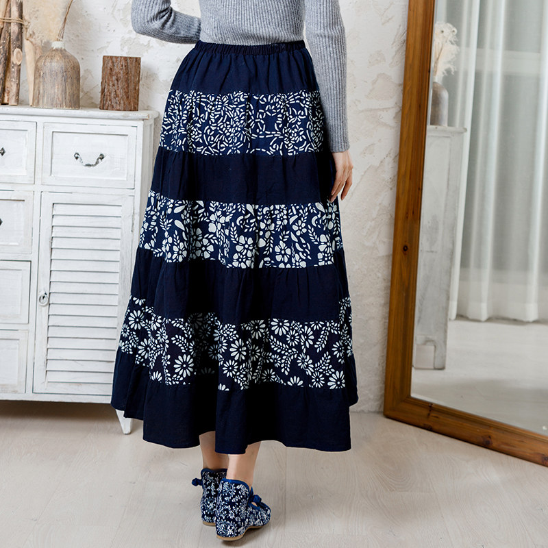 原创民族风乌镇蓝印花布半身裙印花拼接长裙松紧腰大摆裙布艺裙