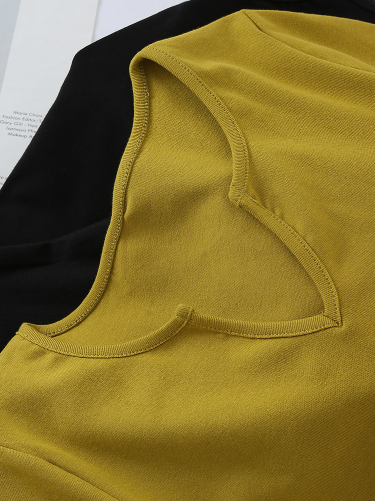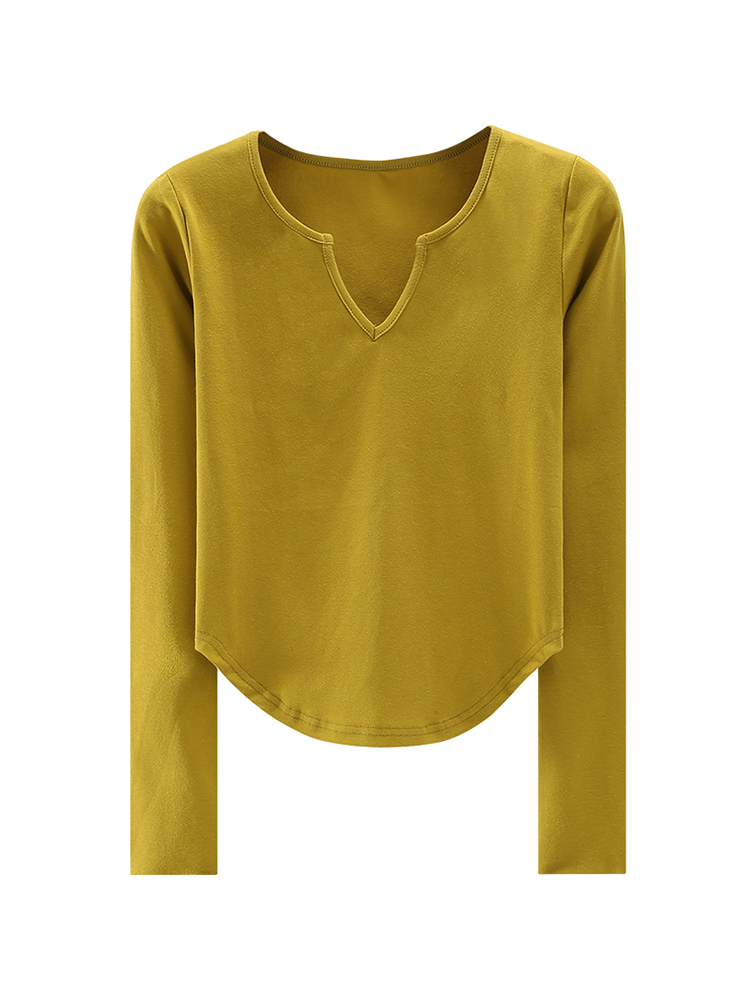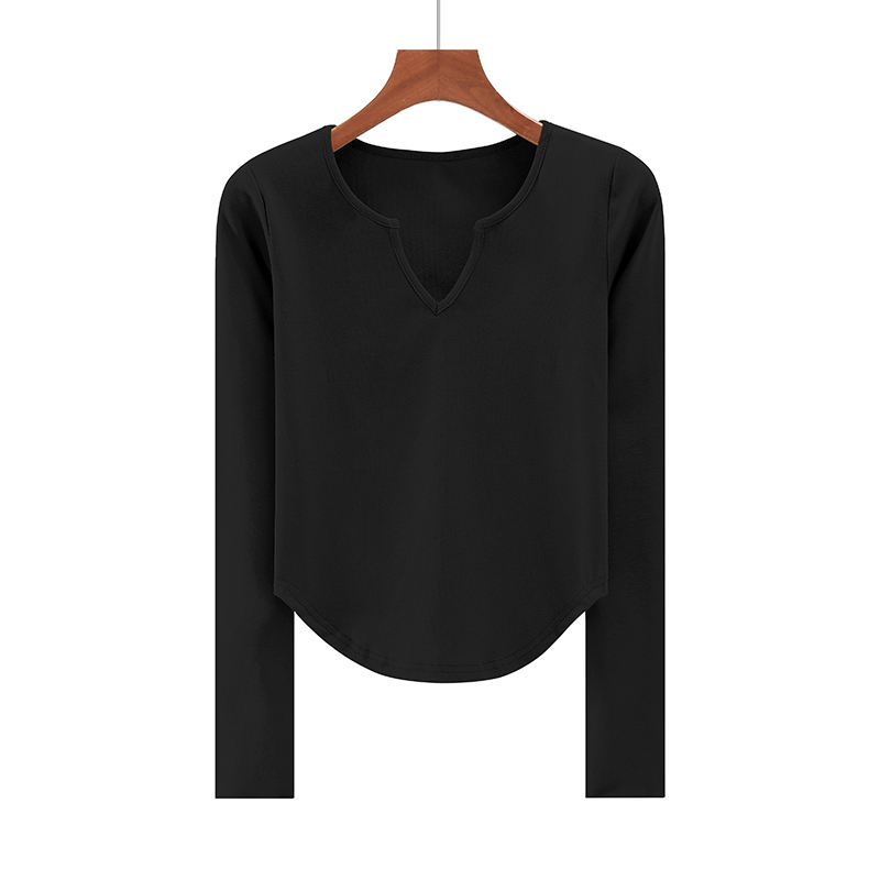 春季新款韩版小V领修身纯色下摆圆弧纯欲纯棉长袖T恤上衣内搭女