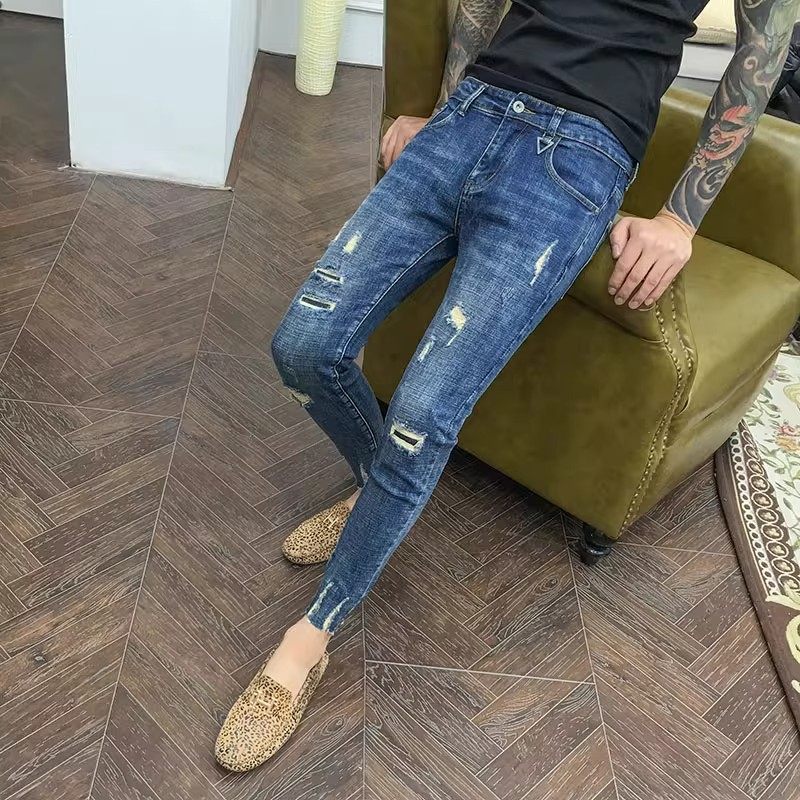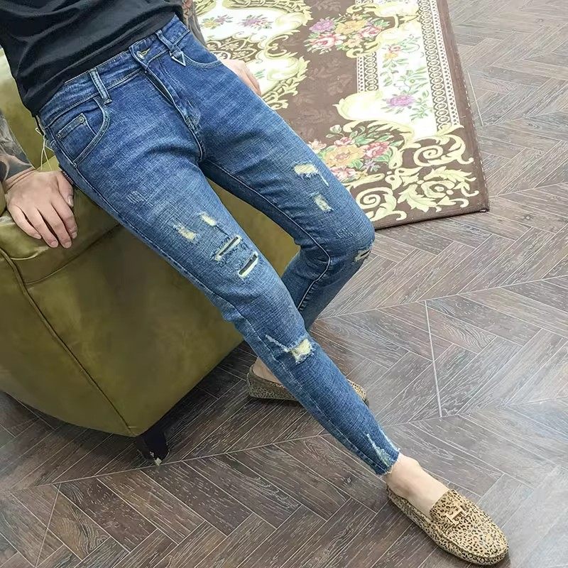 夏季新款修身小脚破洞九分牛仔裤男韩版潮流社会精神小伙网红紧身