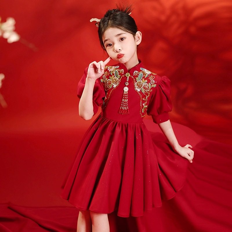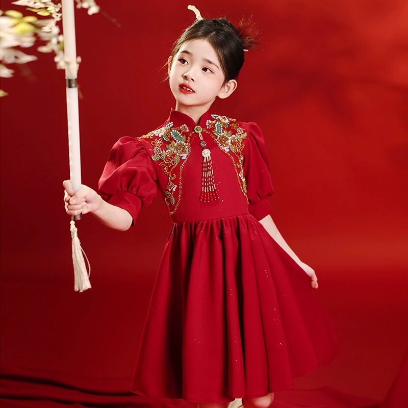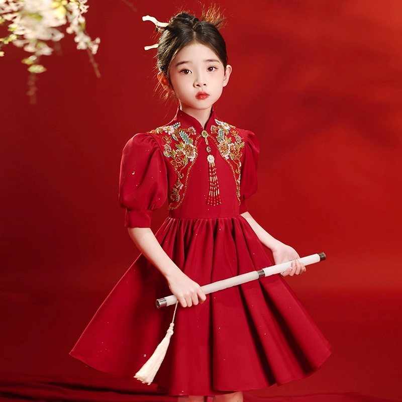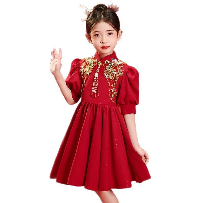 女童旗袍裙夏季新款中大童红色新中式礼服钢琴演出服连衣裙