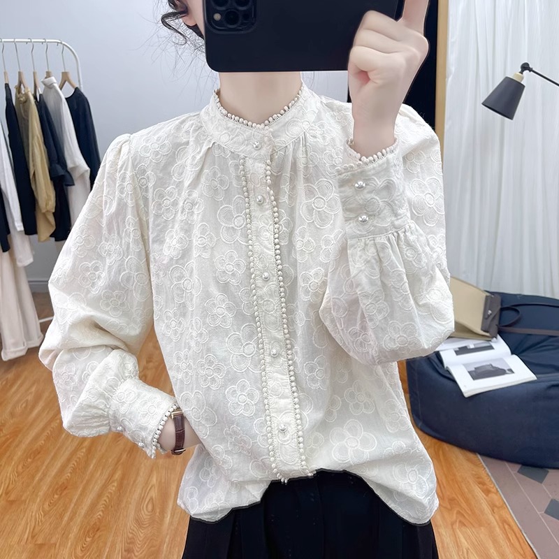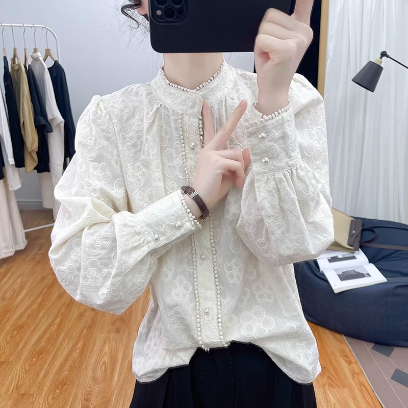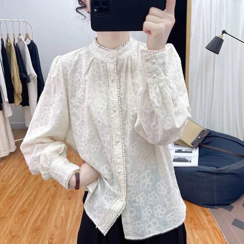 春秋女装高品质立领蕾丝刺绣衬衫复古法式港味打底衫纯棉衬衣上衣