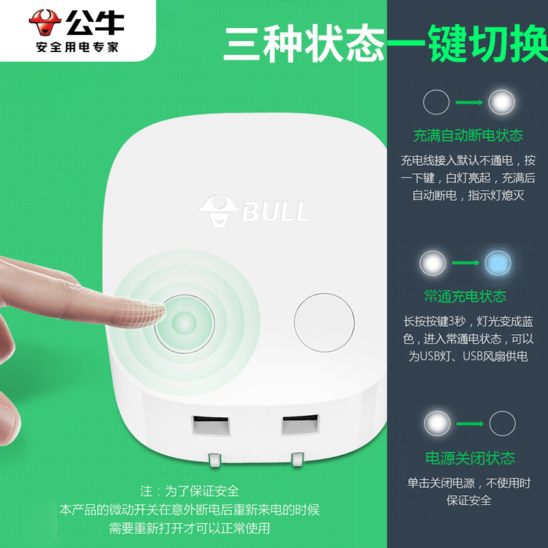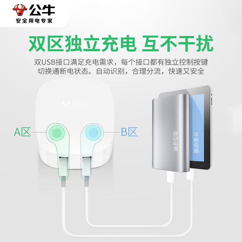 公牛防过充USB充电器手机充满自动断电插线板无线小插座插头U212T