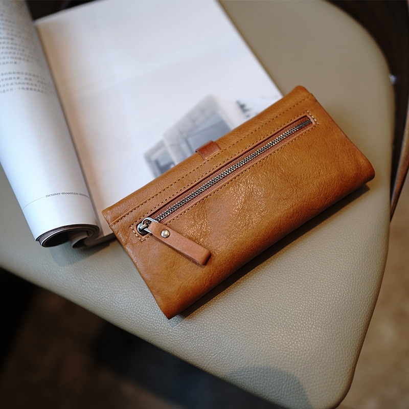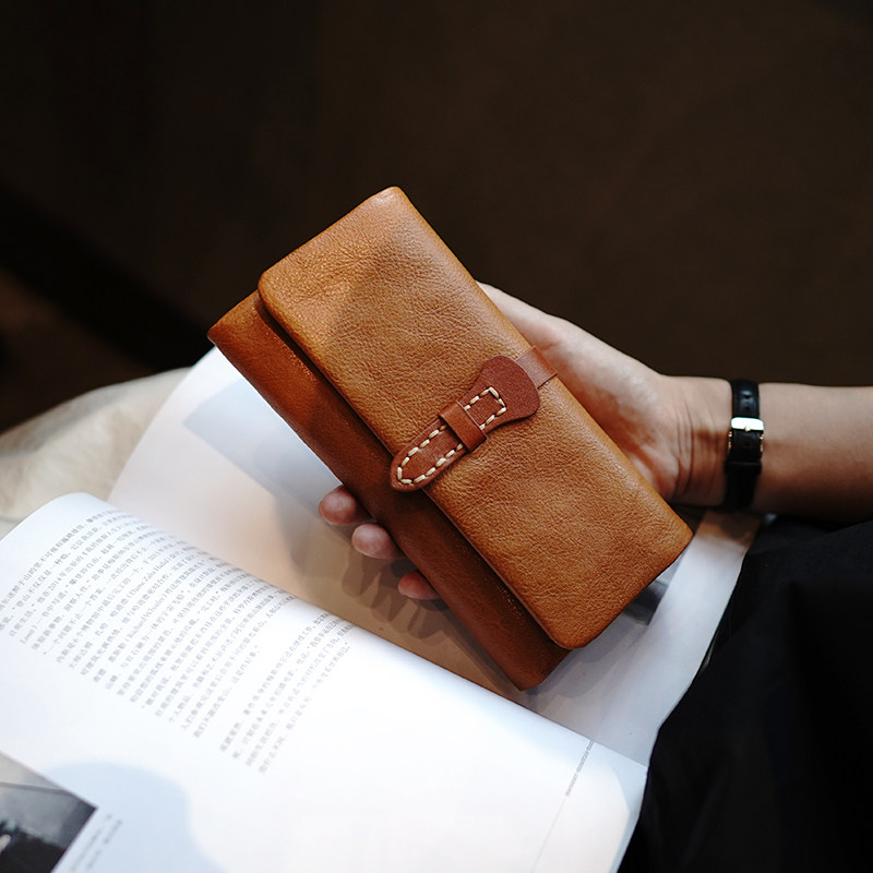 鹿小姐定制植鞣软牛皮文艺复古抽带实用多卡位大容量长款钱包钱夹