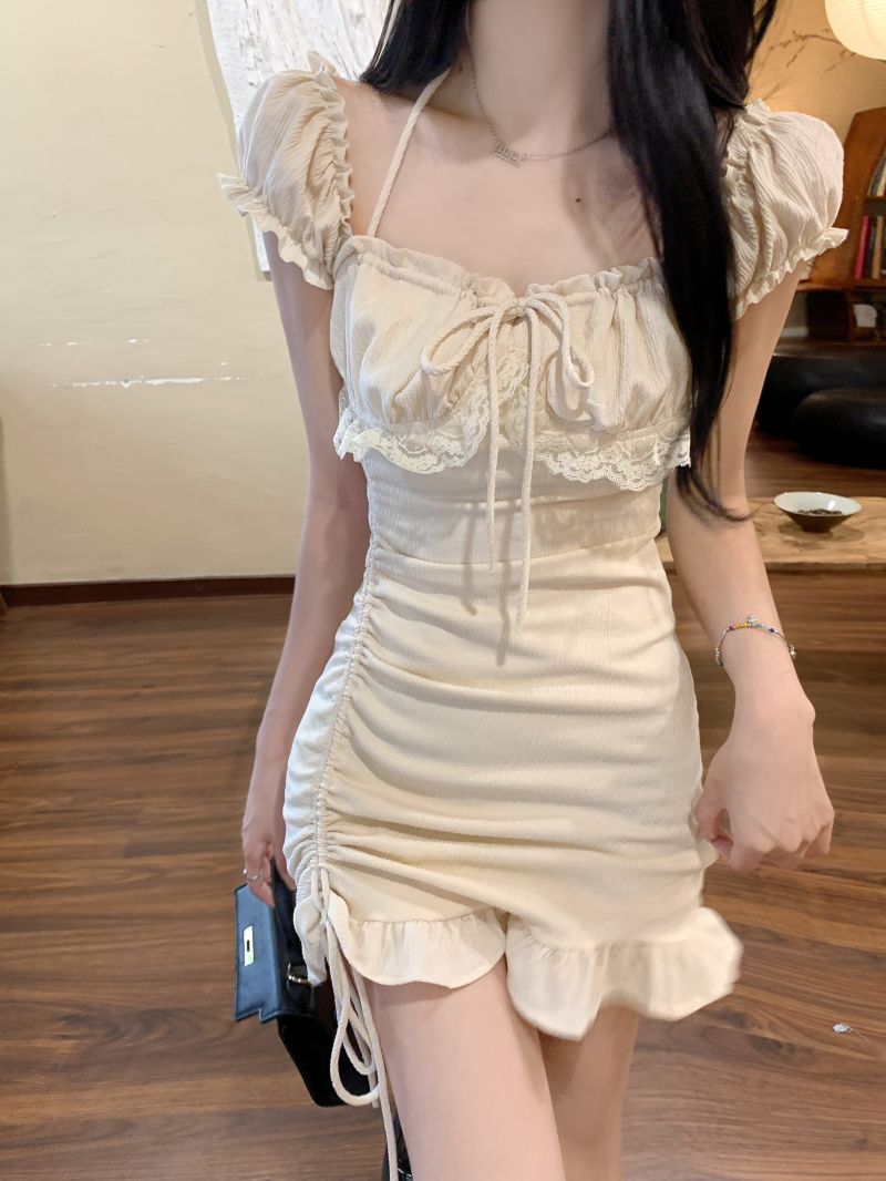 小众纯欲风挂脖吊带连衣裙女夏季2025新款荷叶边辣妹性感包臀短裙