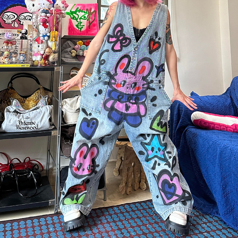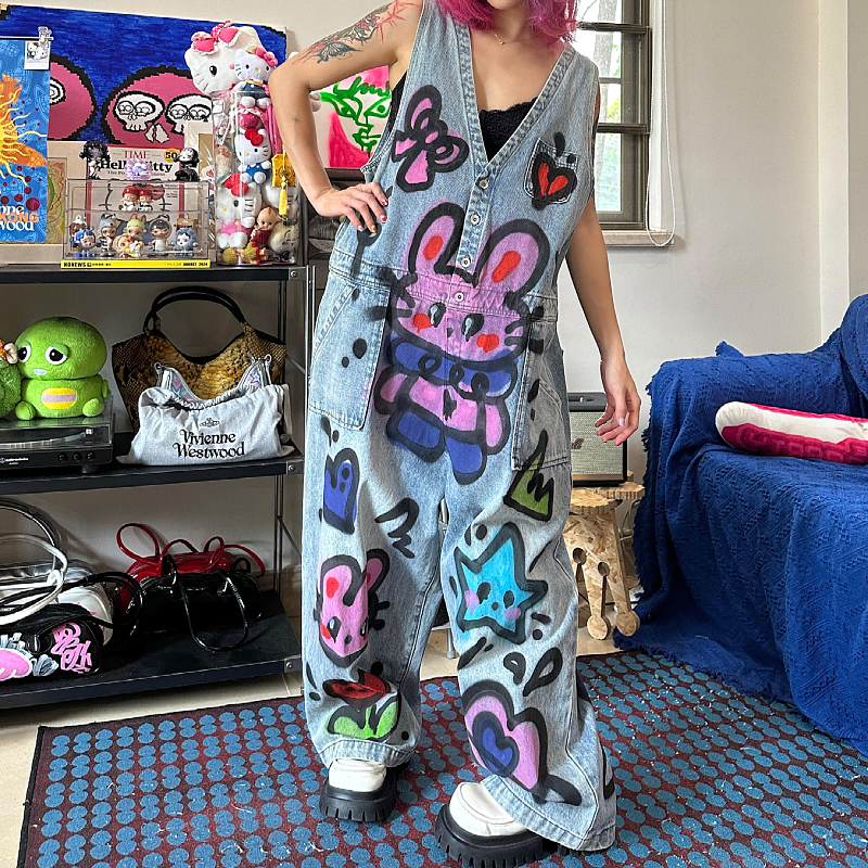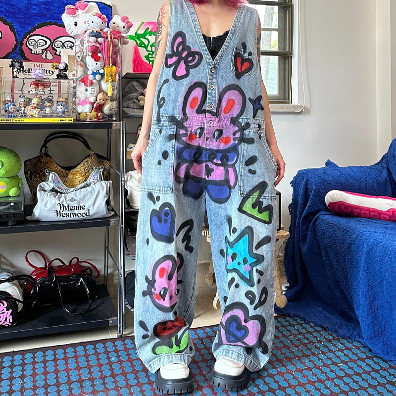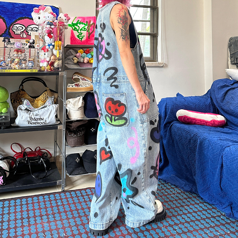 美式大码复古水洗卡通涂鸦牛仔背带裤男女高街廓形宽松显瘦阔腿裤