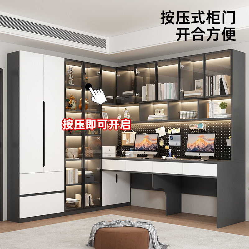 定制实木双人转角书桌书架一体组合电脑桌带玻璃门书柜轻奢学习桌