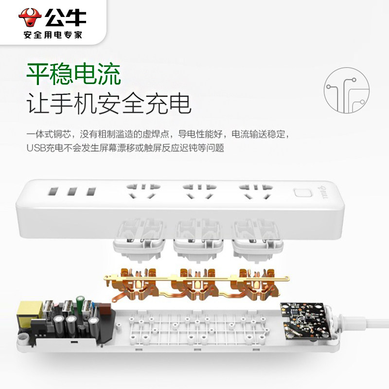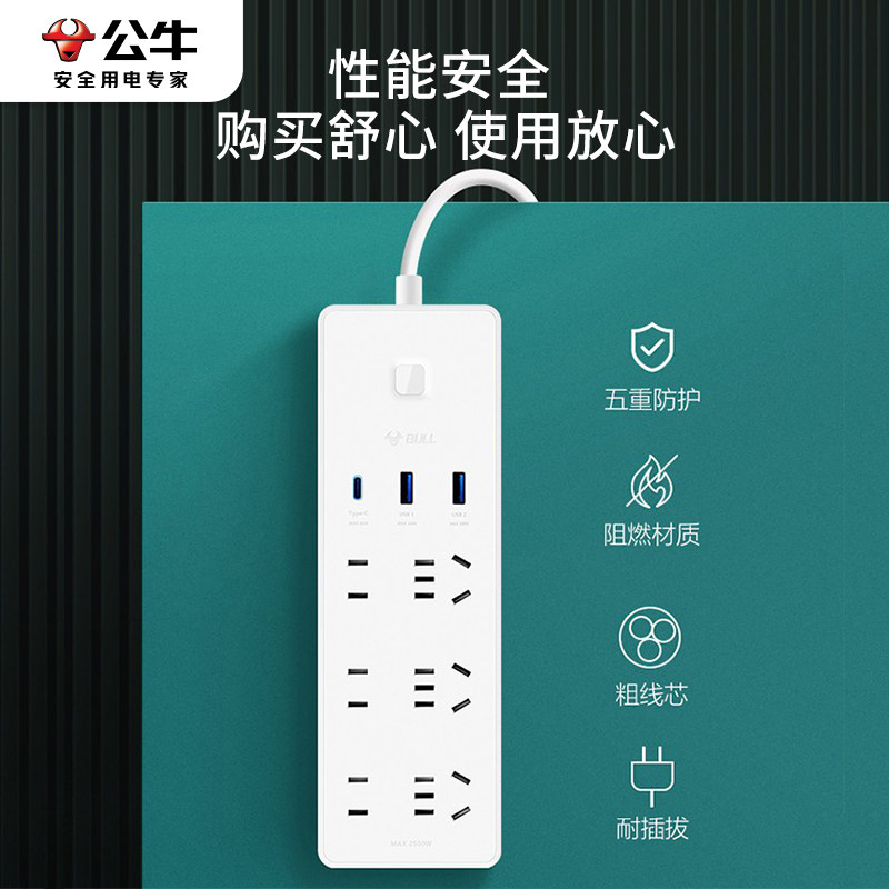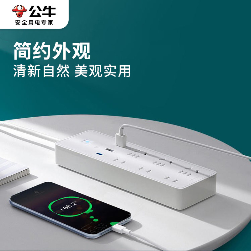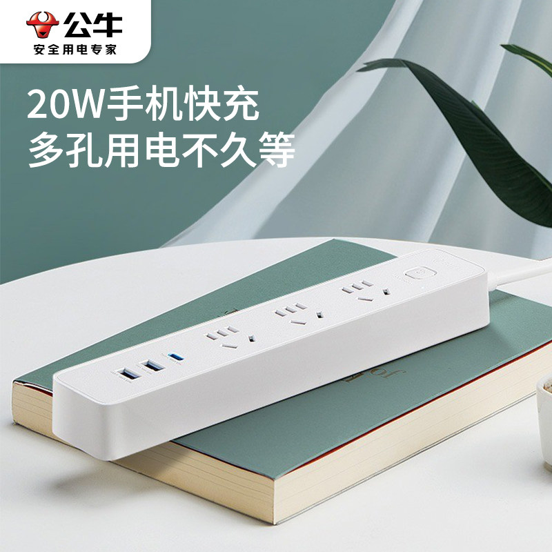 公牛插座带usb快充65W充电器多功能插排家用多孔插板排插线板带线