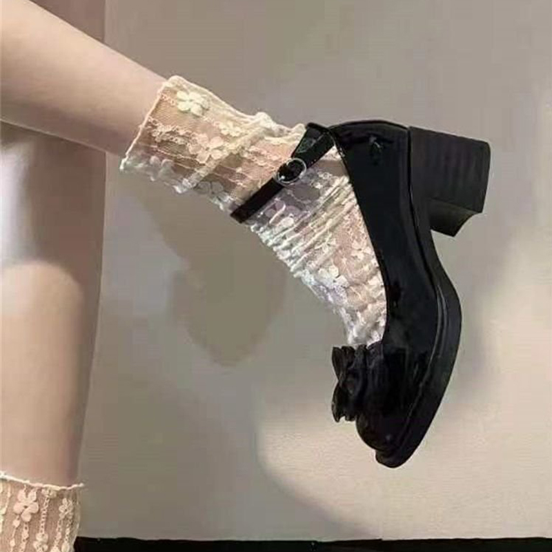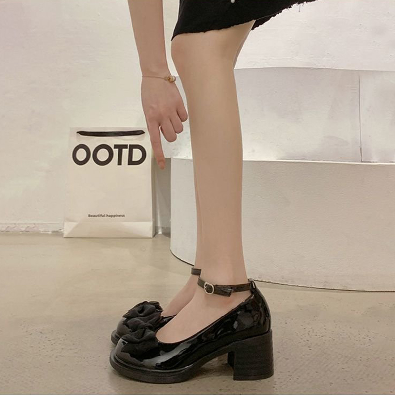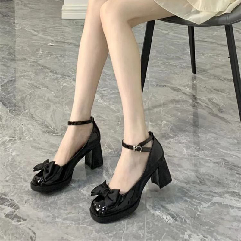 配裙子黑色高跟鞋蝴蝶结一字带学院仙女风漆皮女童少女lo鞋洛丽塔