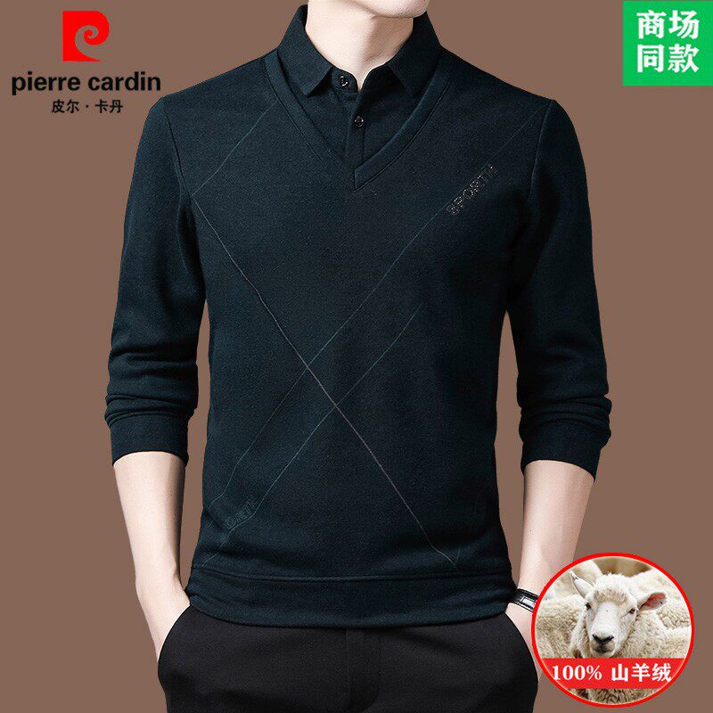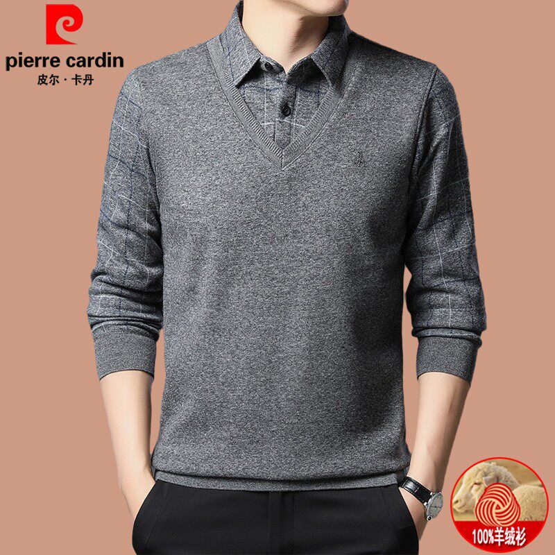 皮尔卡丹高端100%纯羊绒衫男假两件秋冬加绒毛衣衬衫领加厚打底衫