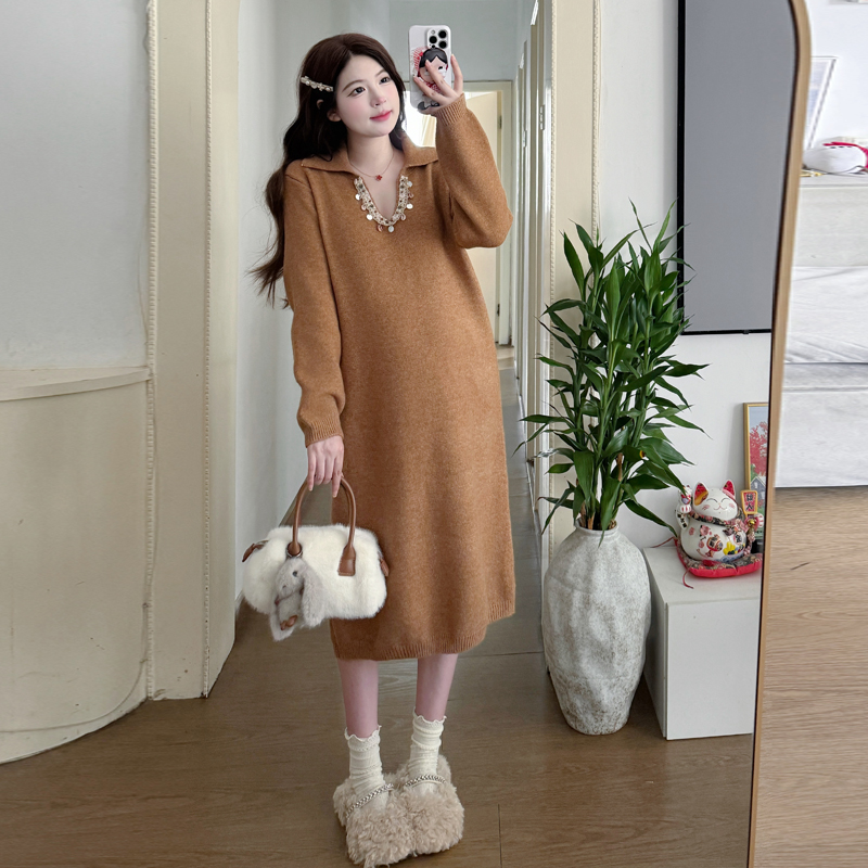 孕妇连衣裙秋冬2025新款焦糖色v领温柔百搭针织打底毛衣裙中长款