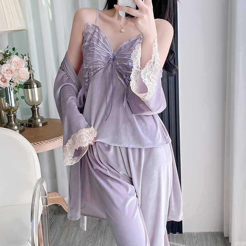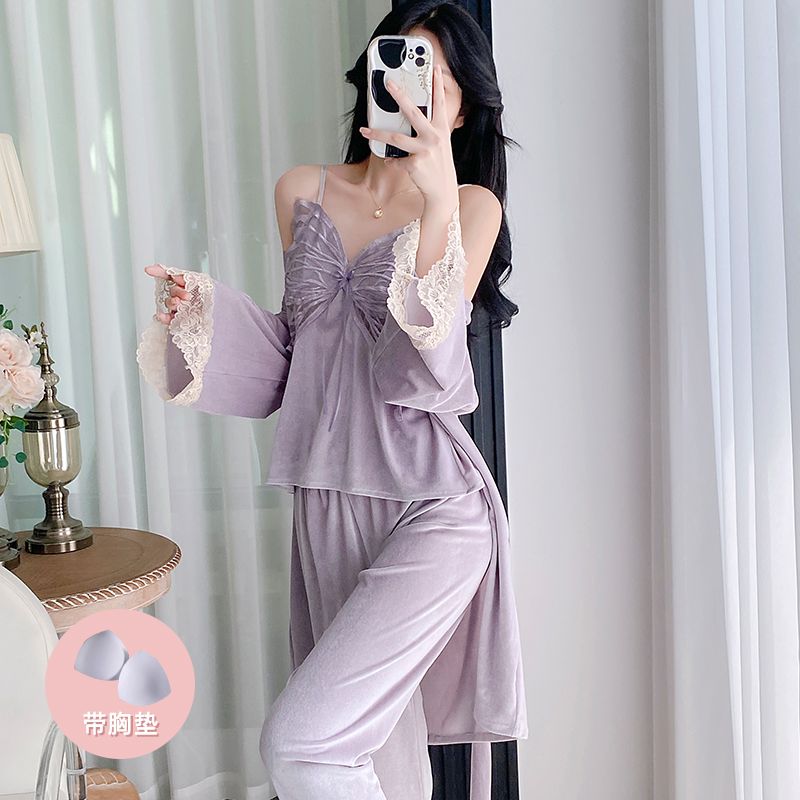 蝴蝶三件套金丝绒睡衣女春秋季保暖家居服性感带胸垫吊带长裤长袖