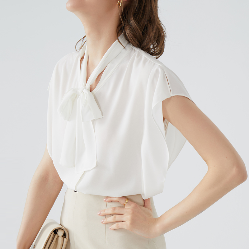 宿·色雪纺衬衫女夏薄款飞飞袖别致上衣韩版V领系带两穿设计衬衣