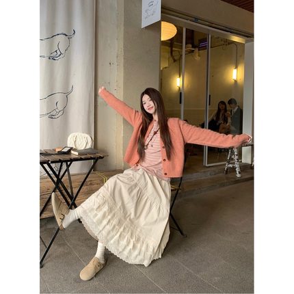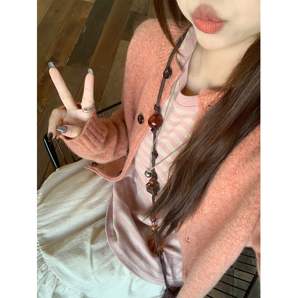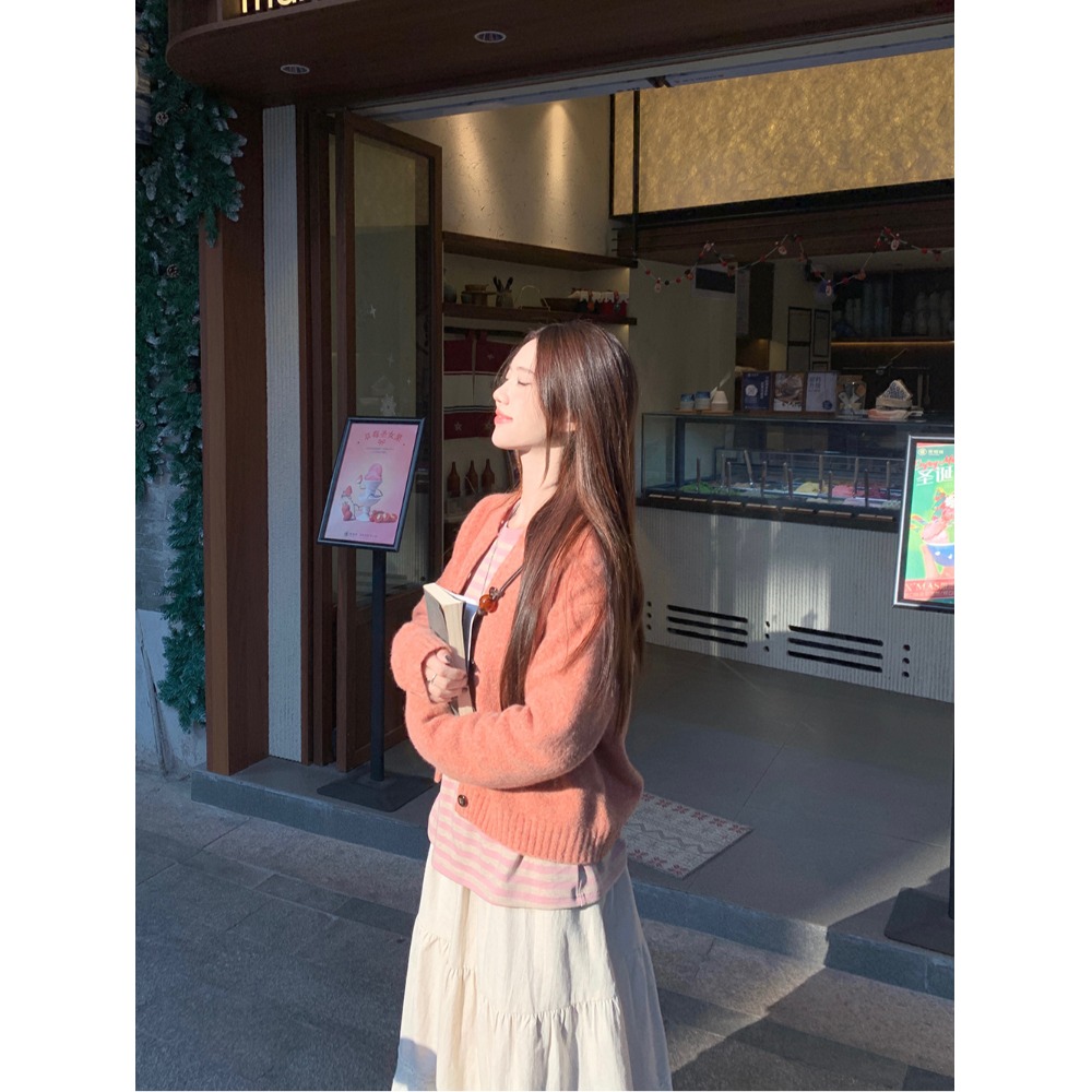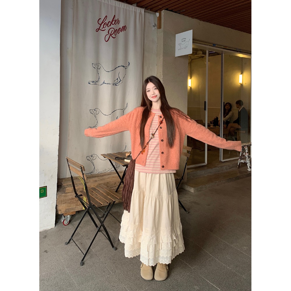 温柔风套装软糯针织开衫女条纹T恤2024冬季新款花边半身裙三件套