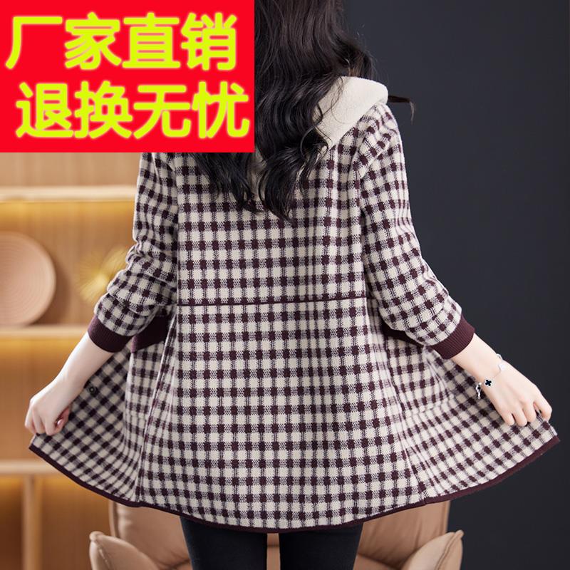 中长款年轻妈妈连帽格子毛呢外套秋冬新款大码宽松显瘦中老年女装