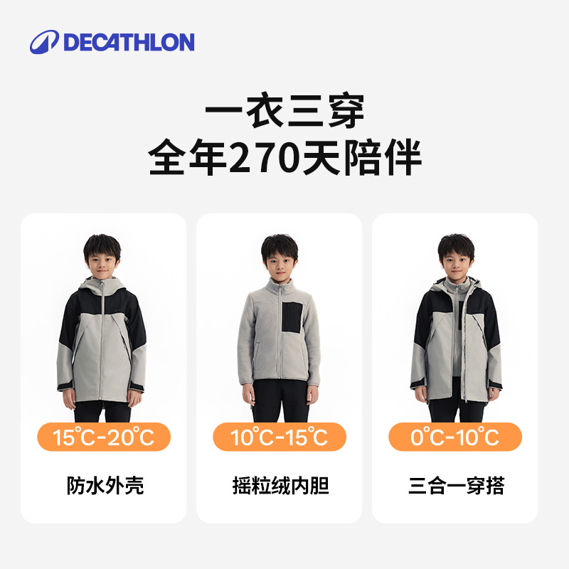 迪卡侬儿童秋冬三合一摇粒绒保暖棉服男童女童可防风防水外套KIDS