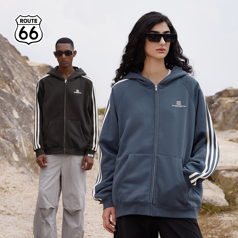 ROUTE66秋季连帽开衫卫衣男2025新款美式复古休闲情侣加绒外套女