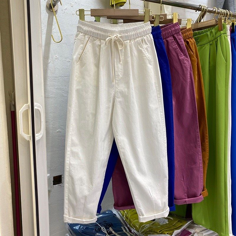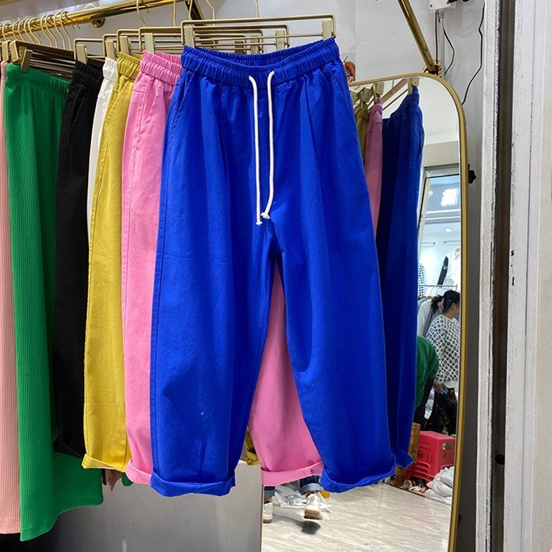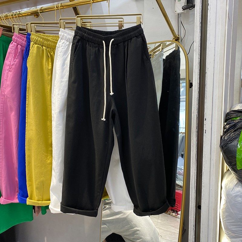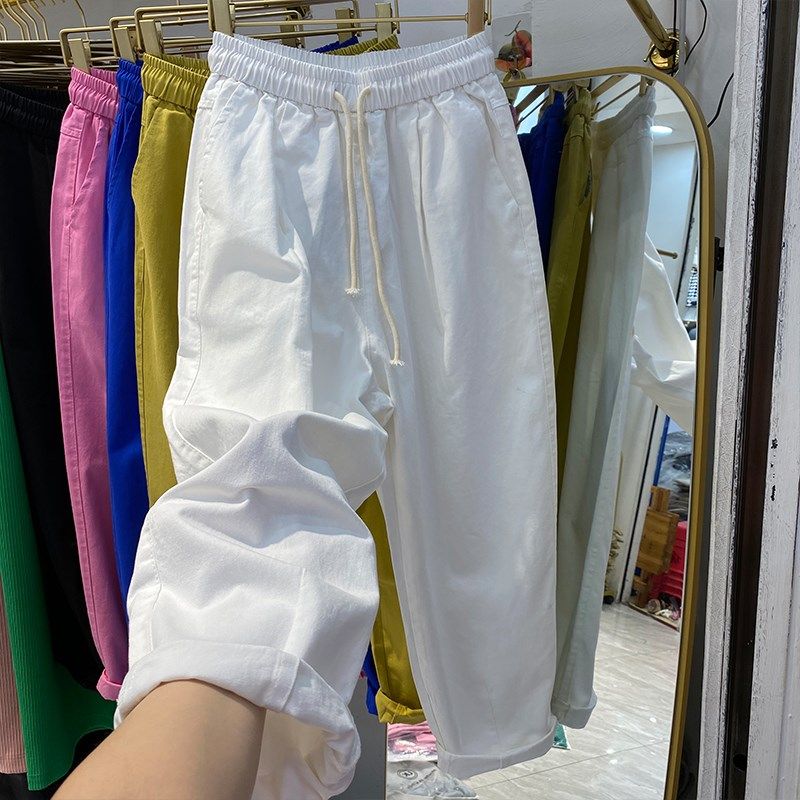 纯棉薄款休闲裤女春夏直筒裤百搭大码宽松阔腿哈伦裤松紧腰九分裤
