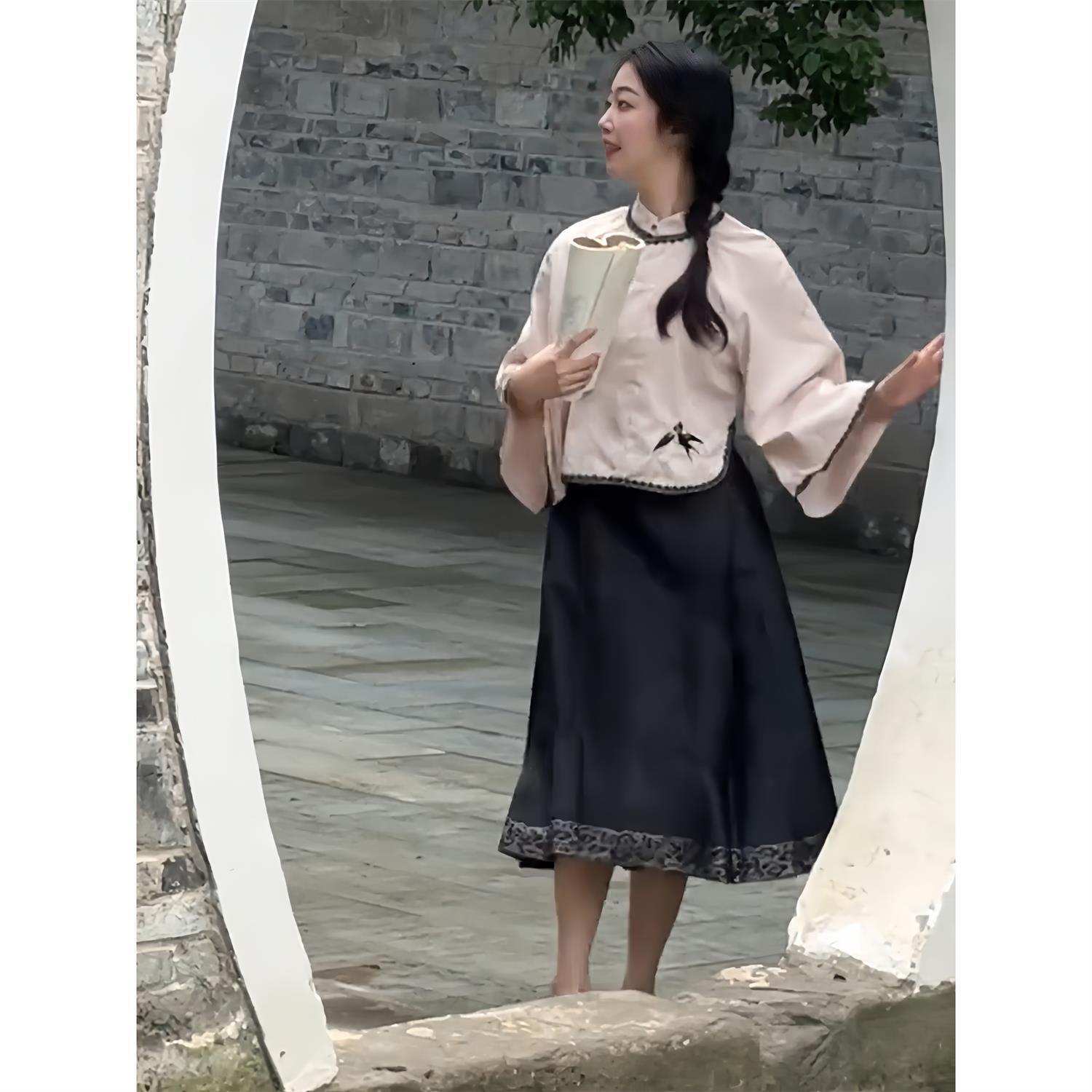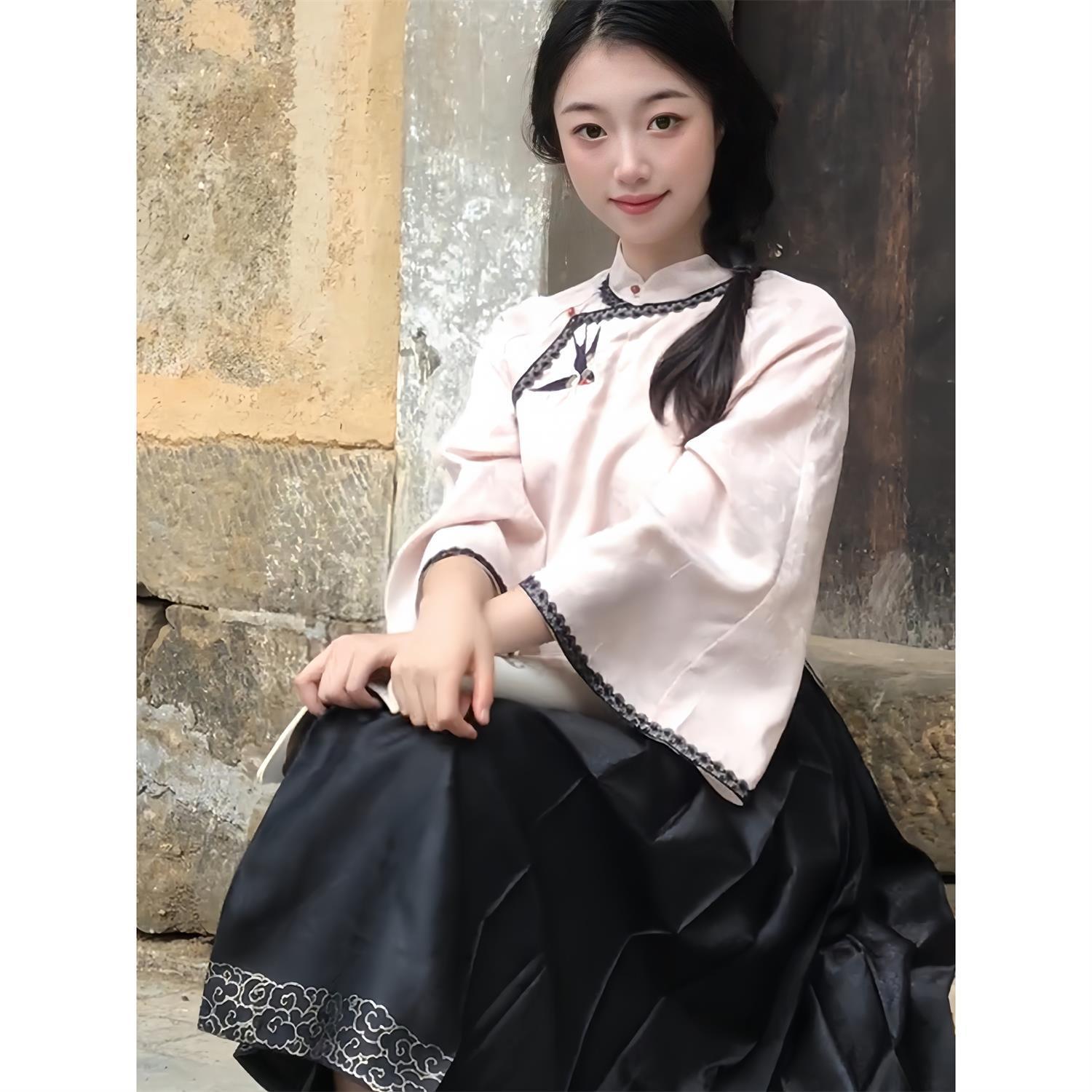 [粉妆楼]国风立领斜襟刺绣短衫暗纹提花上衣长袖衬衫马面裙套装女