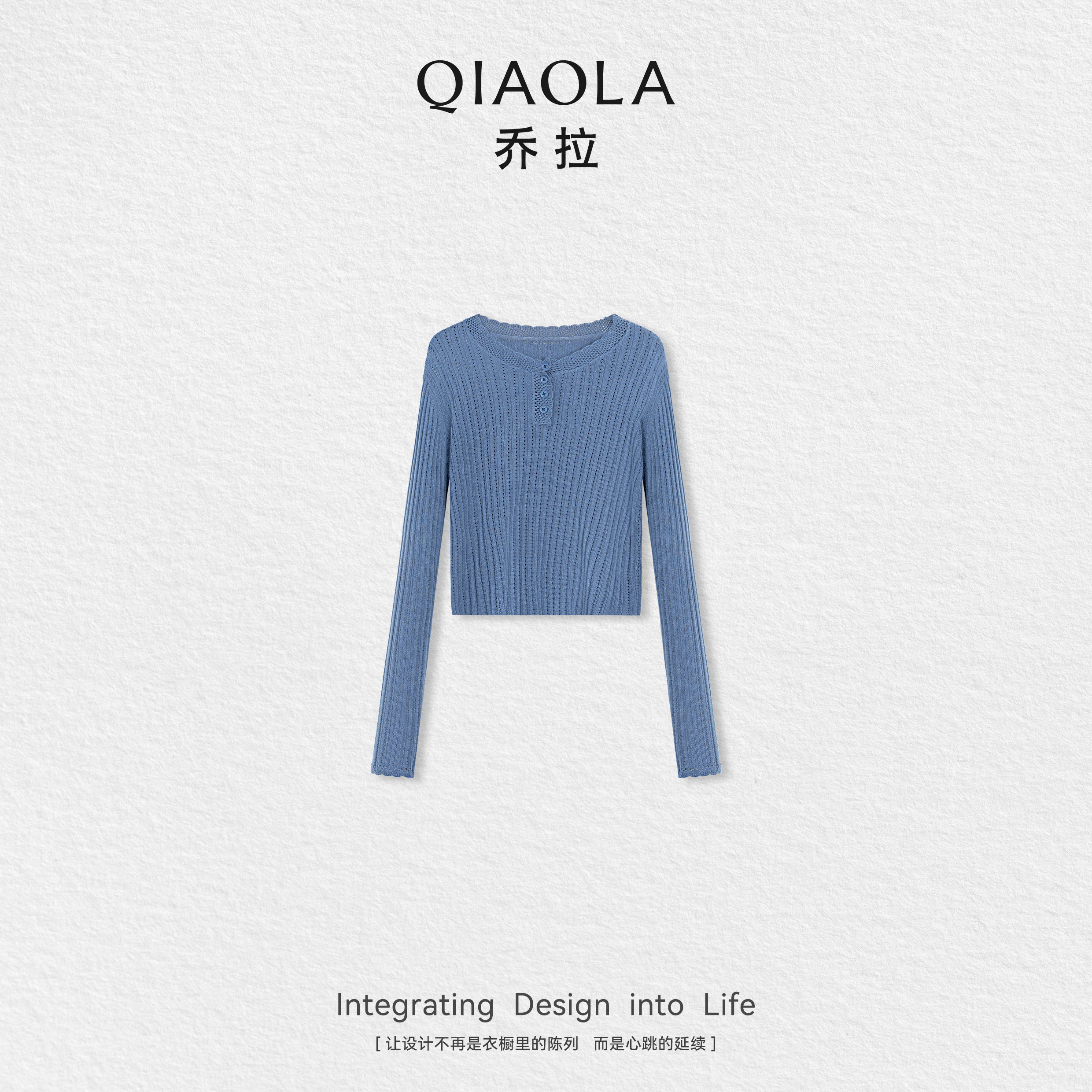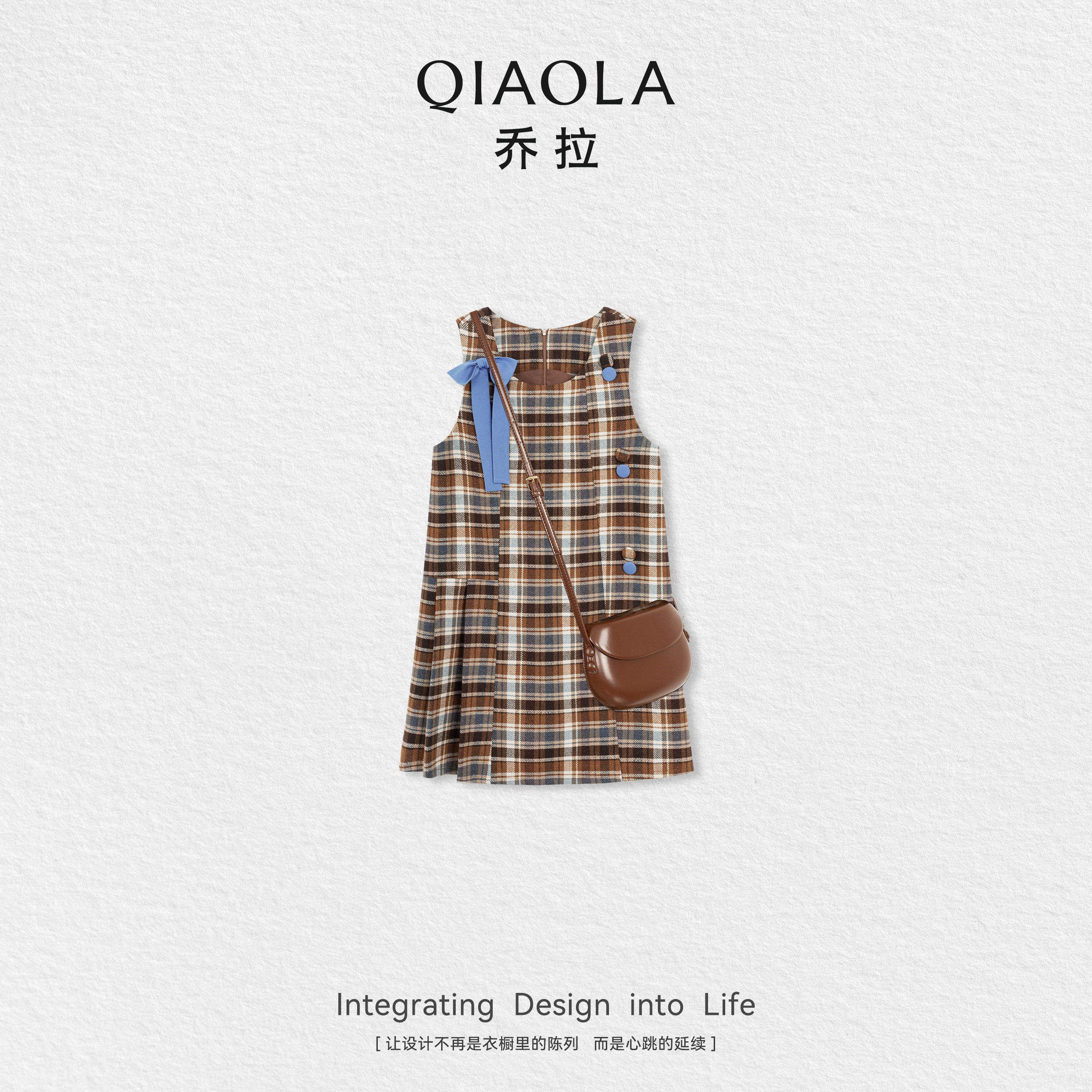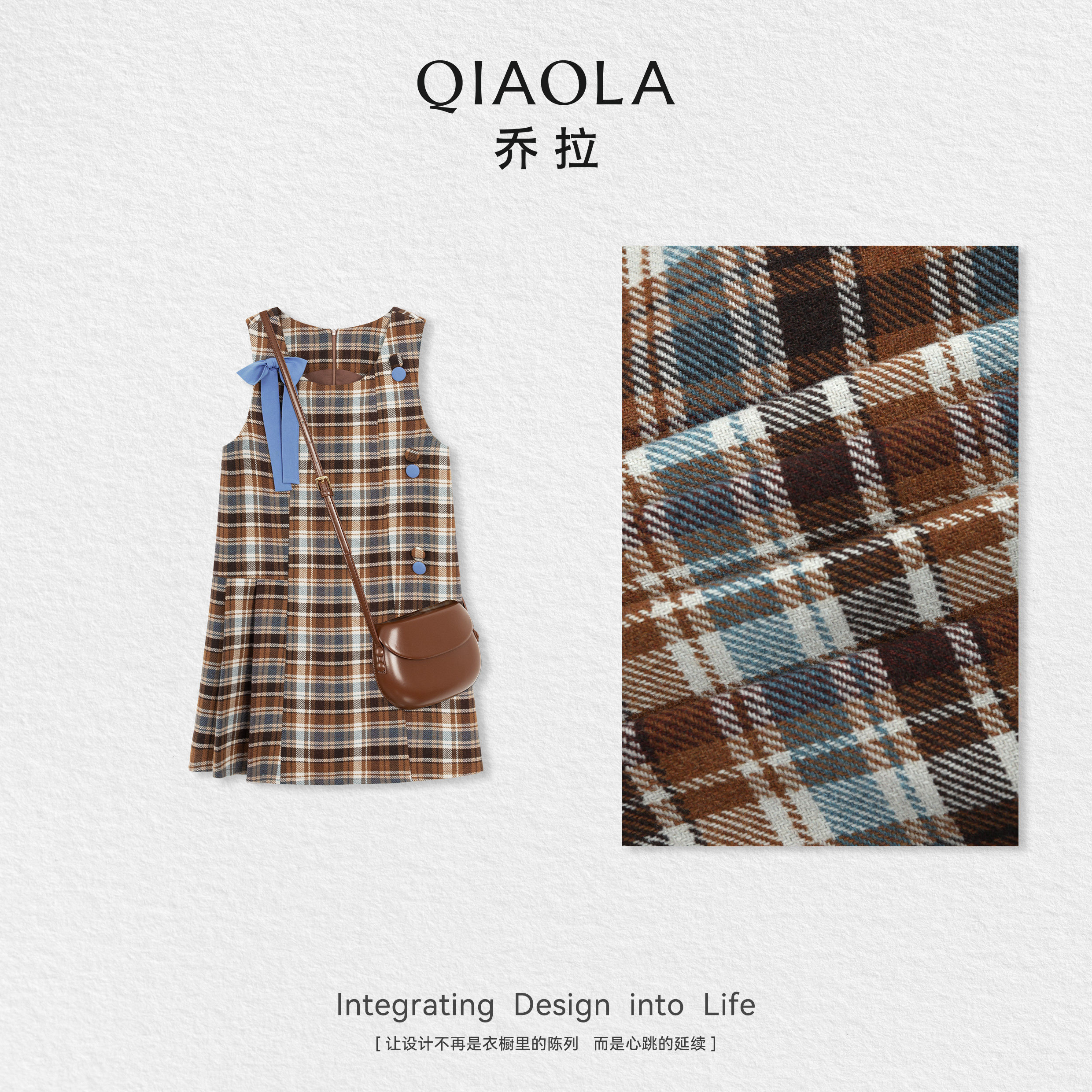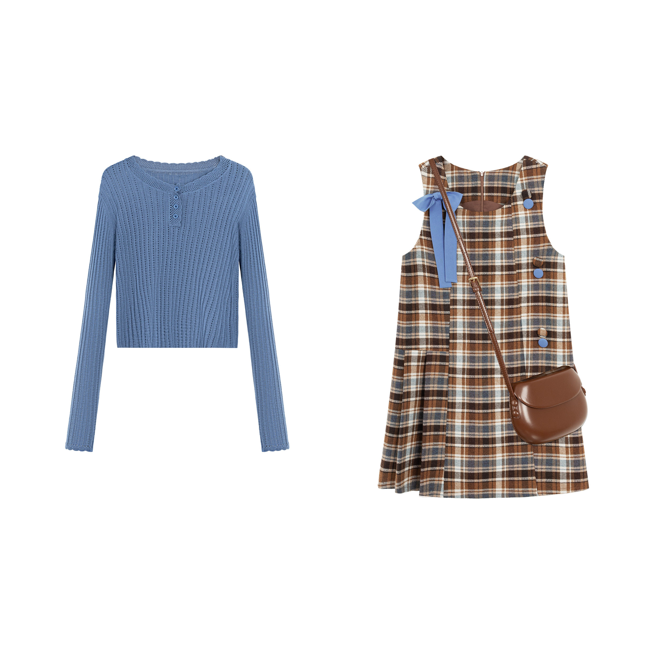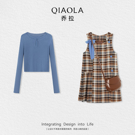 乔拉【晴川牧野】秋季新款蓝色长袖打底衫上衣格纹无袖连衣裙女