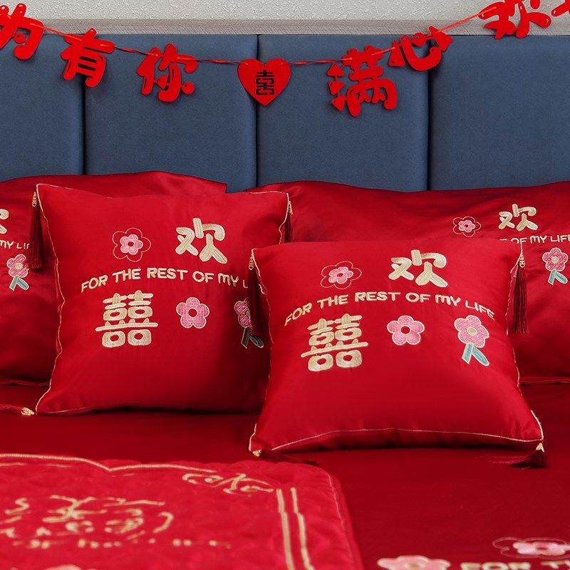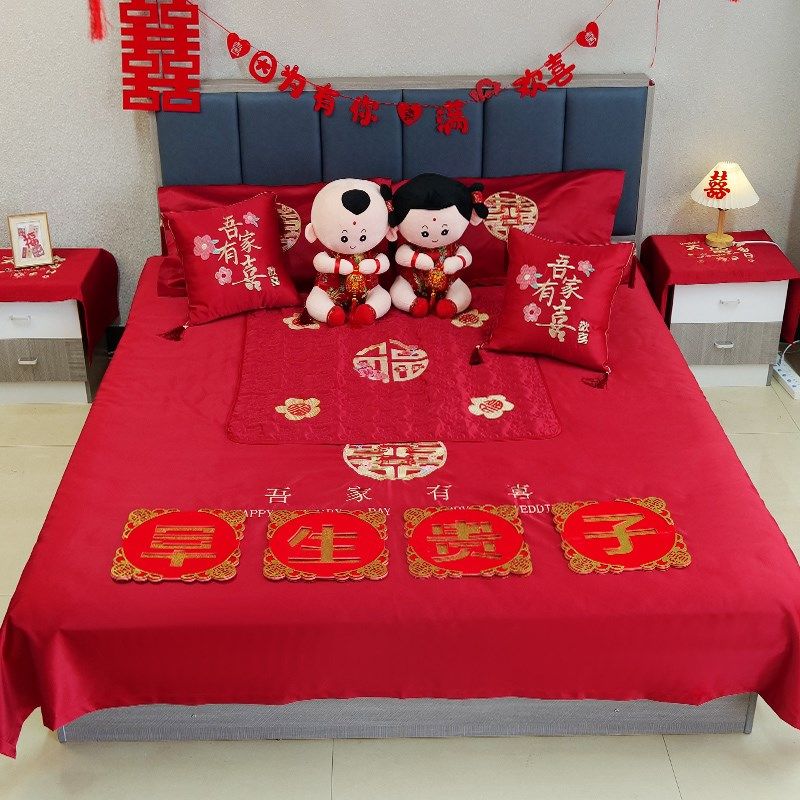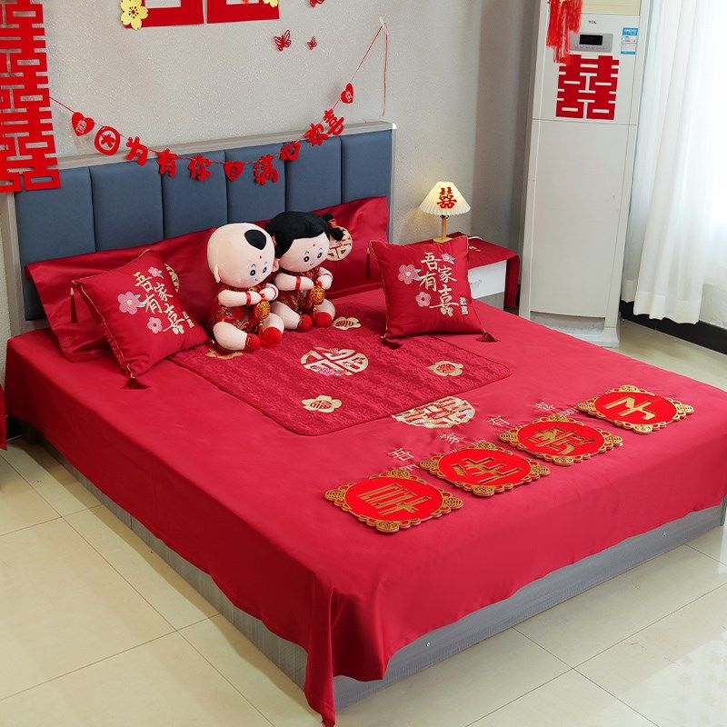 结婚房红床单三件套女方陪嫁刺绣枕套被单婚床Q布置全抱枕压床娃