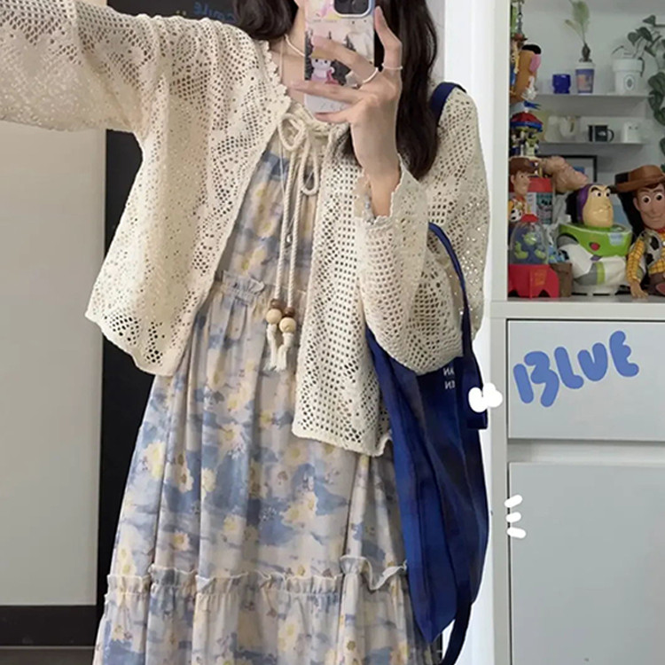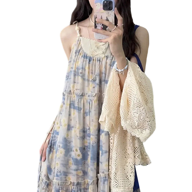 法式复古浪漫蓝色微胖mm吊带碎花连衣裙子女夏季温柔风仙女款长裙