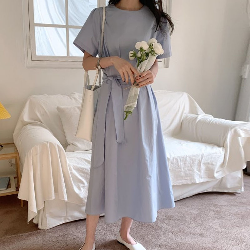 韩国chic 夏季温柔简约圆领褶皱感系带收腰纯色短袖连衣裙长裙女