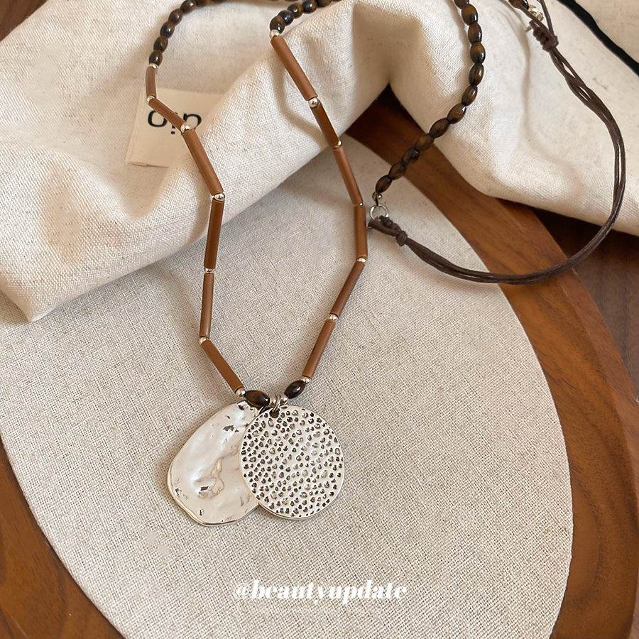 复古木珠串珠几何圆形褶皱吊坠项链民族风锁骨链小众设计感毛衣链