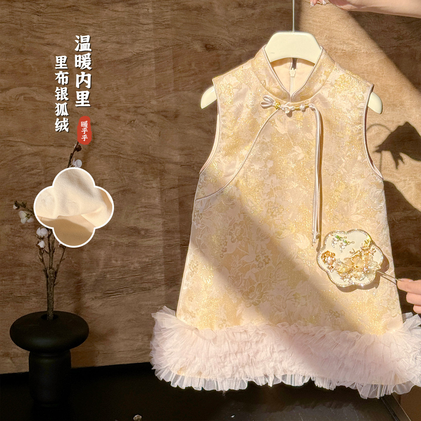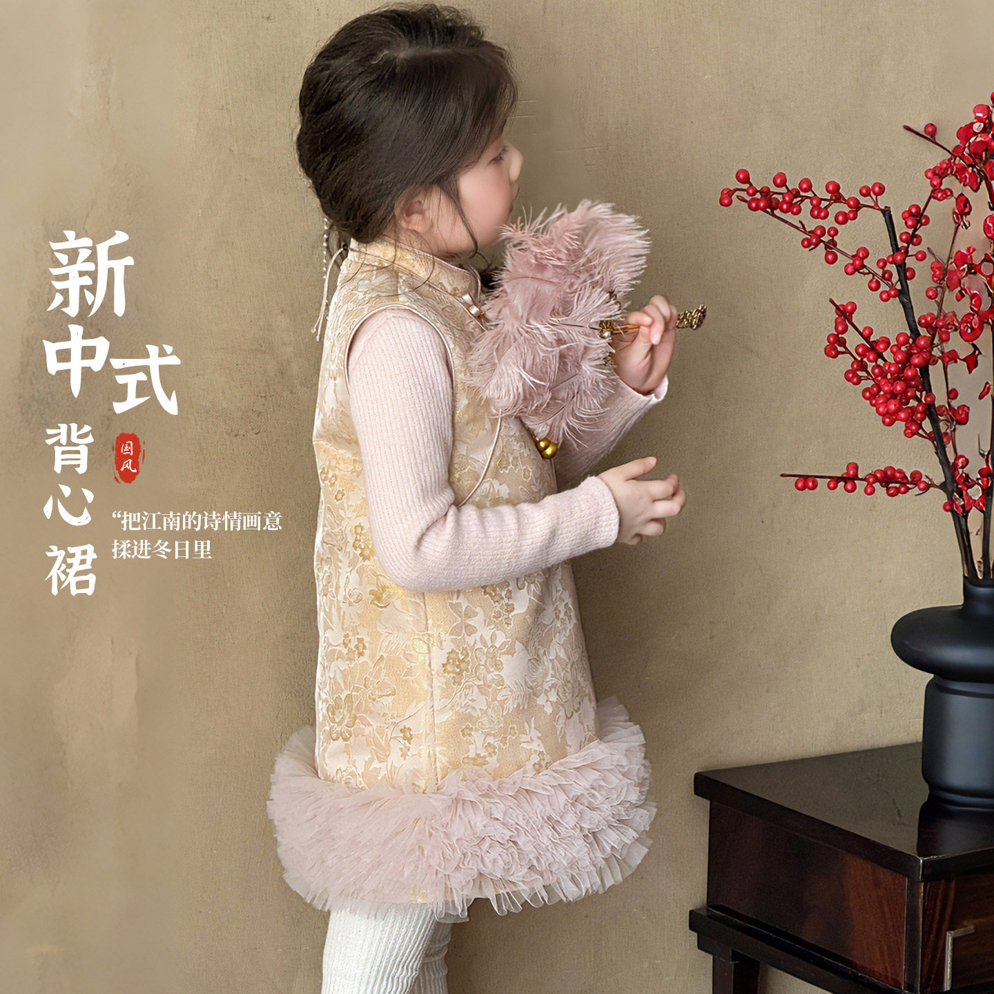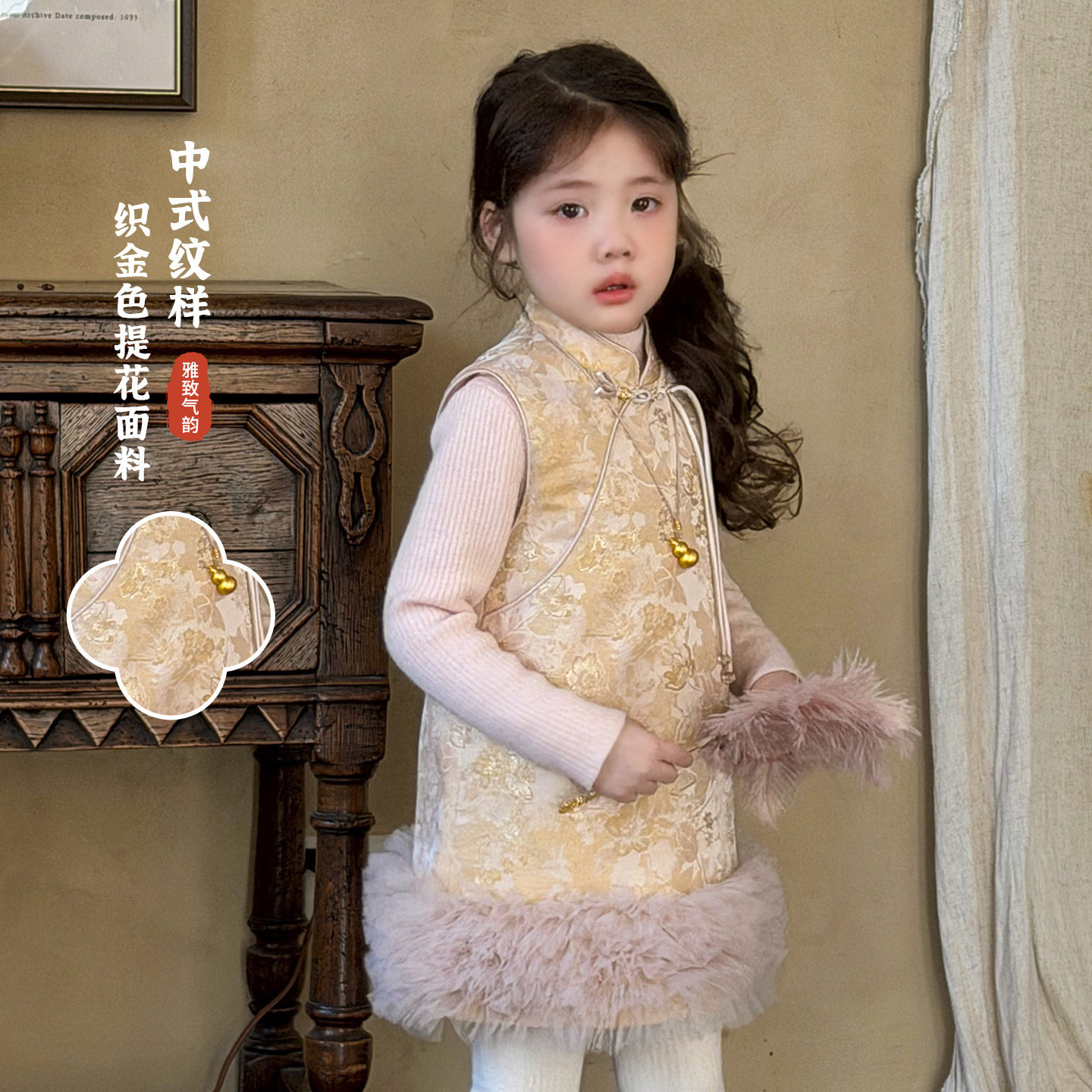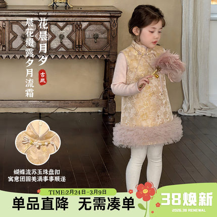 大小卷新中式拜年服背心裙女童冬季新款儿童国风汉服夹棉连衣裙