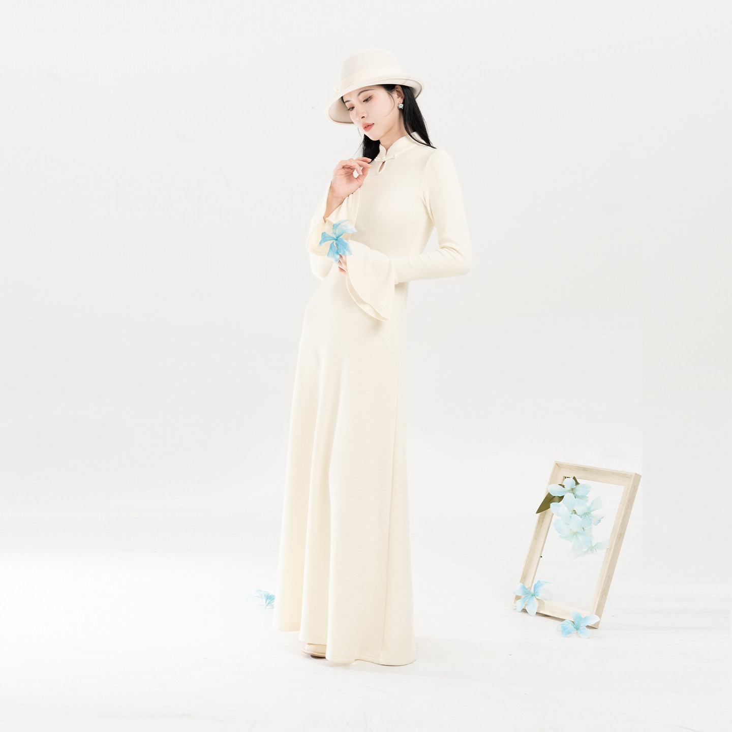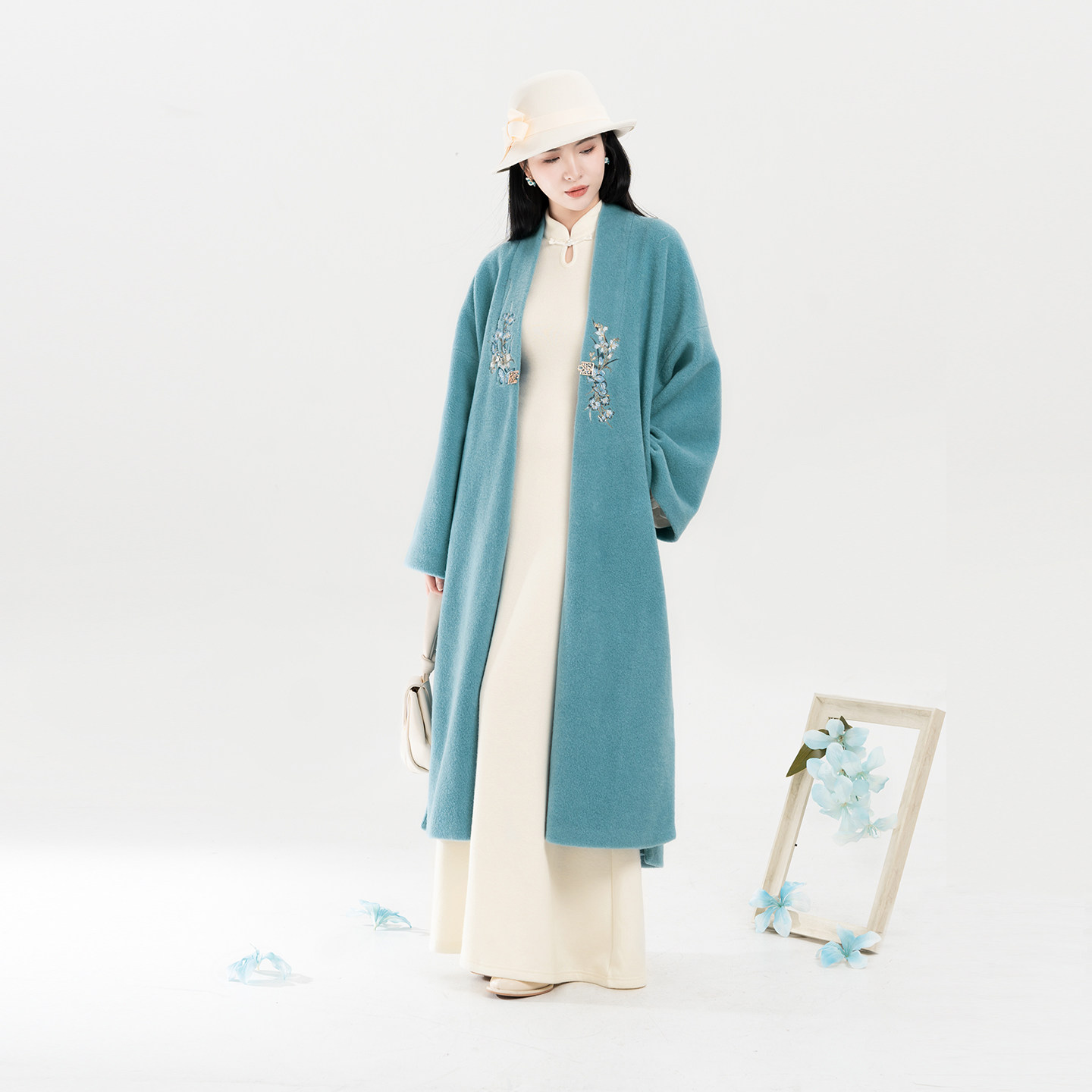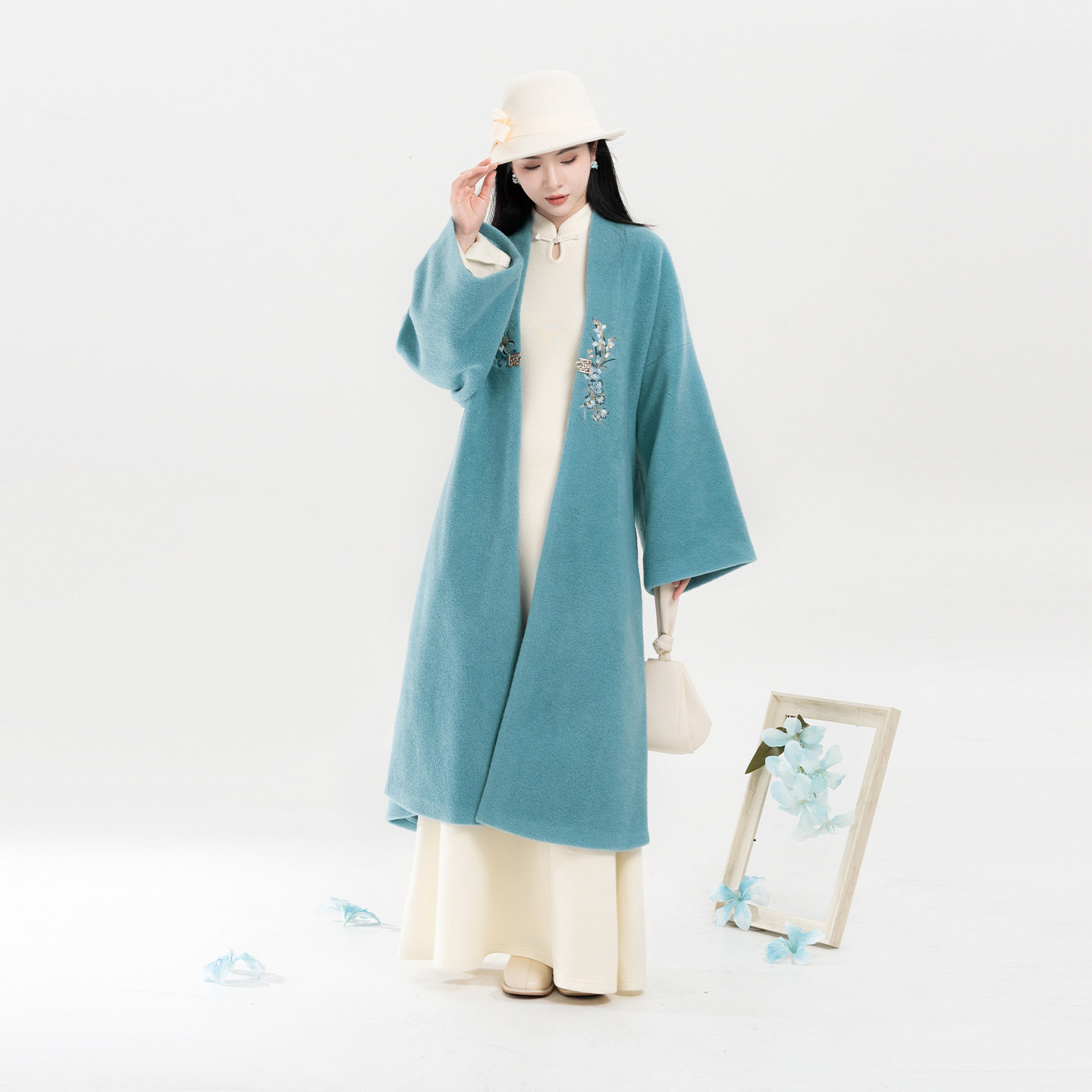 织造司[湖心雪]汉元素刺绣明对襟毛呢大衣外套小立领长袖连衣裙女