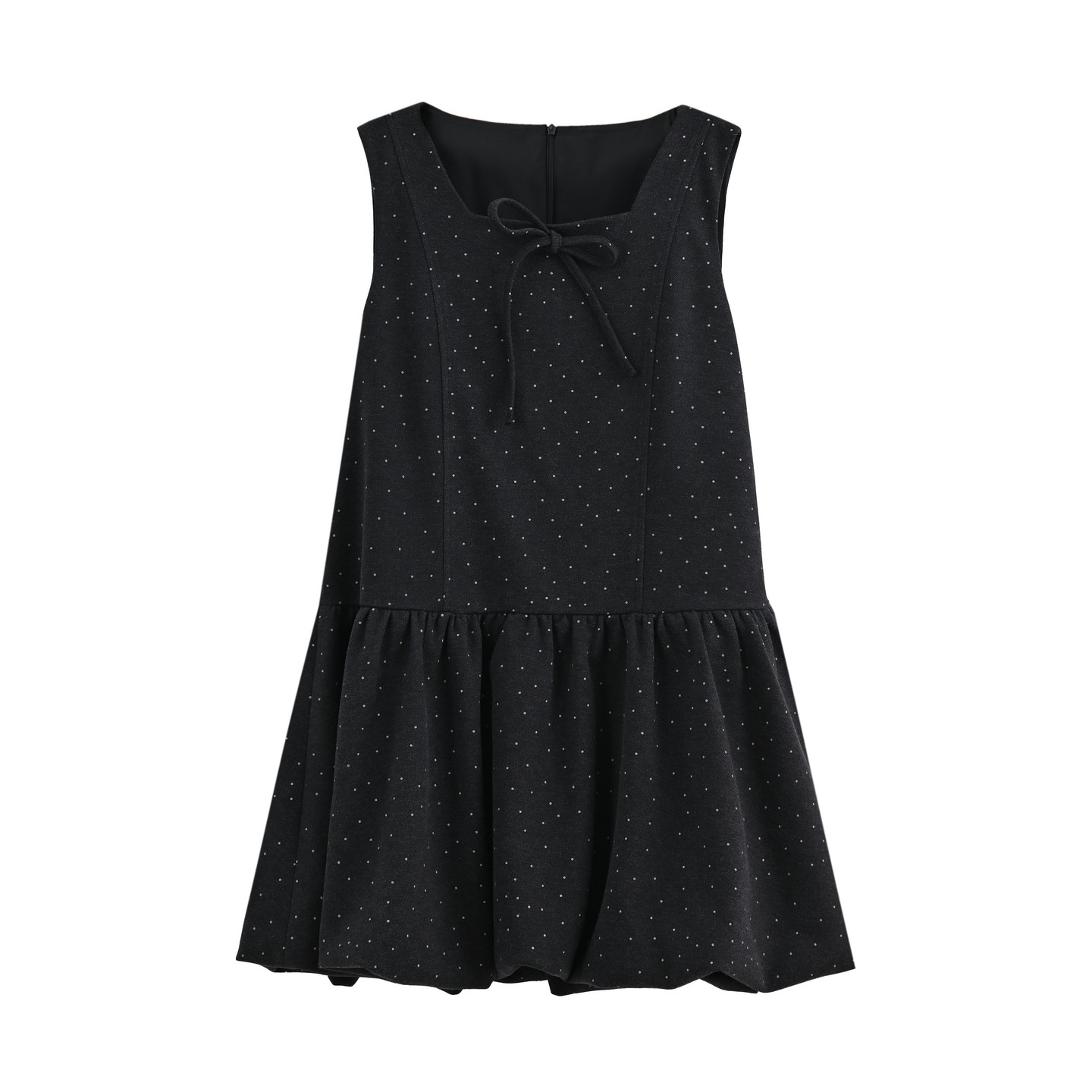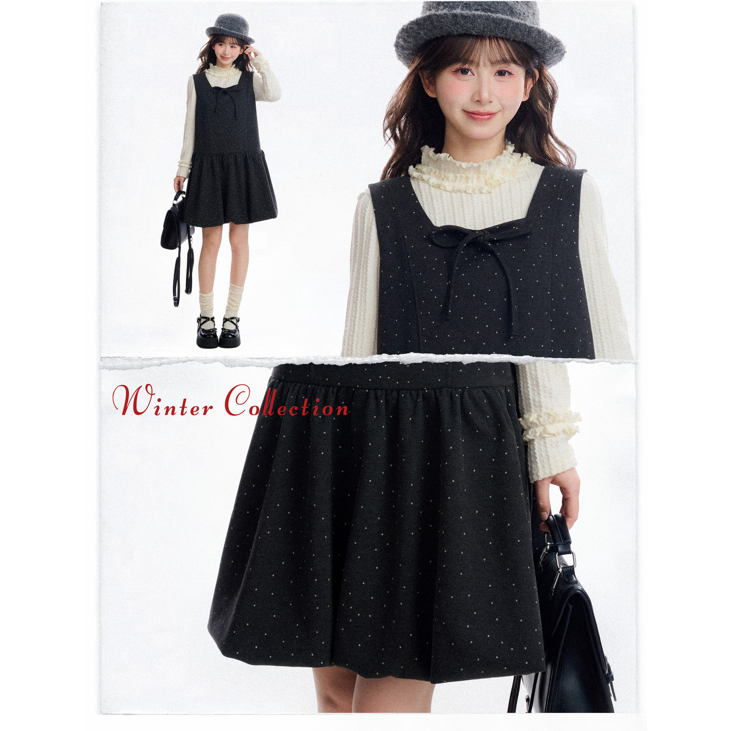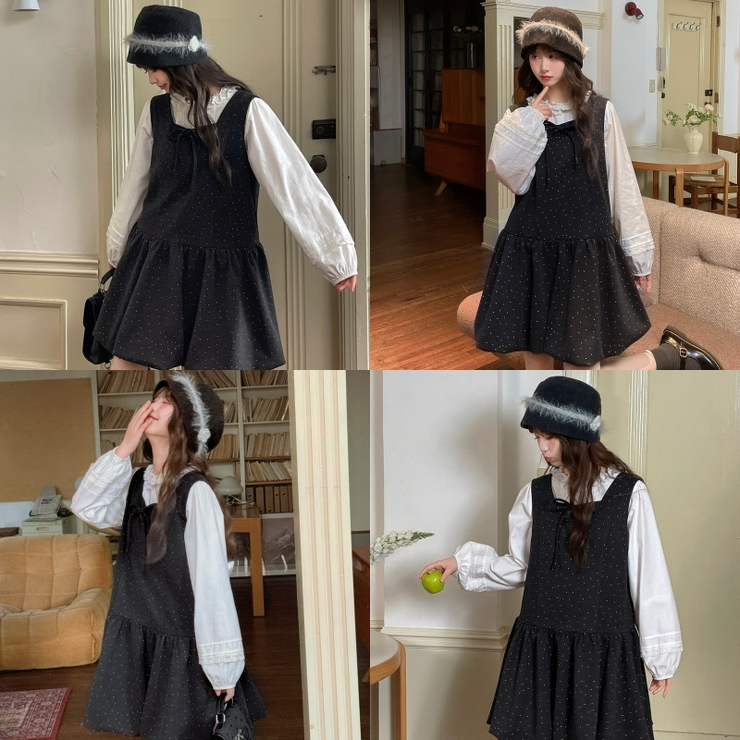 森女部落甜美风波点背心裙女百褶裙摆新款早春百搭叠穿宽松连衣裙