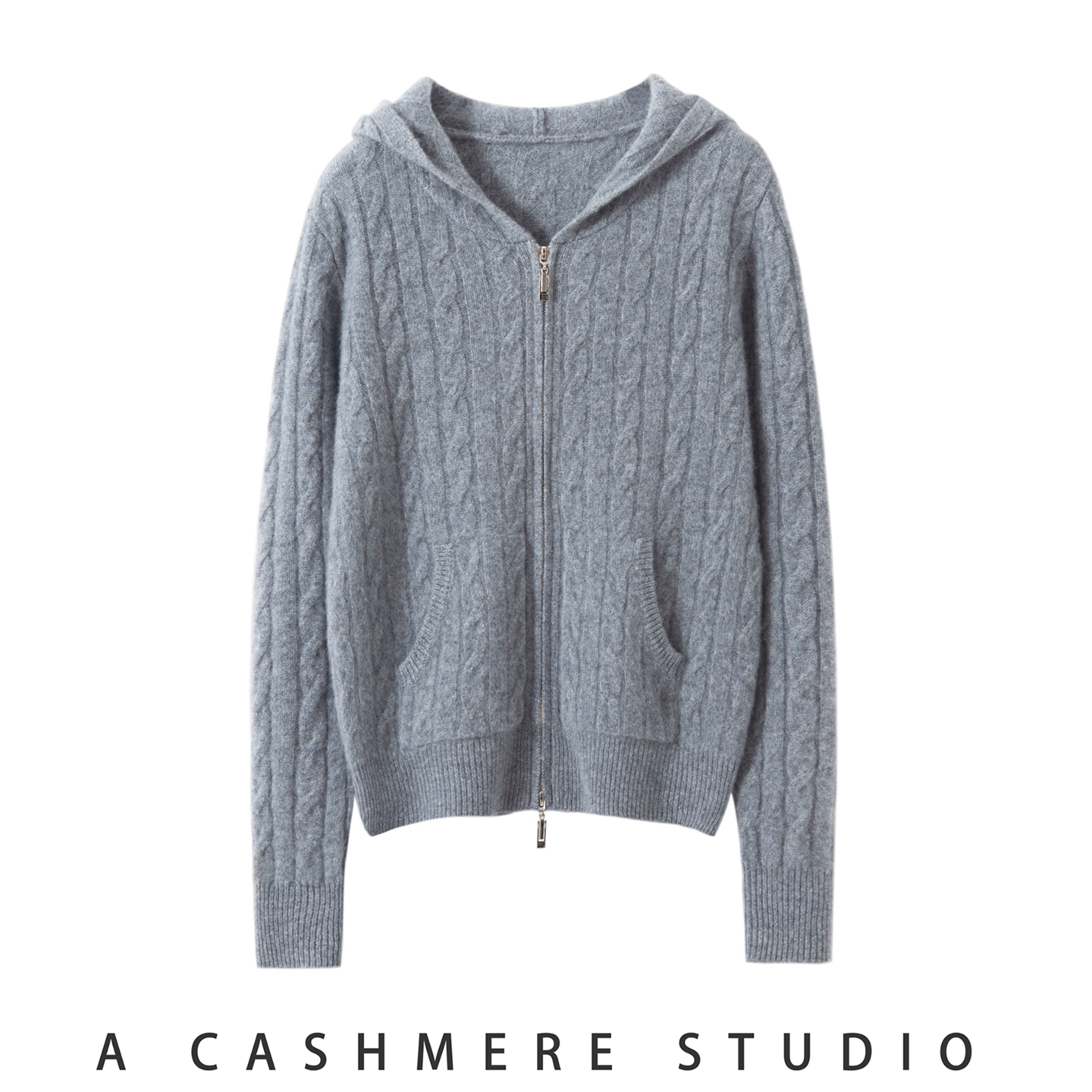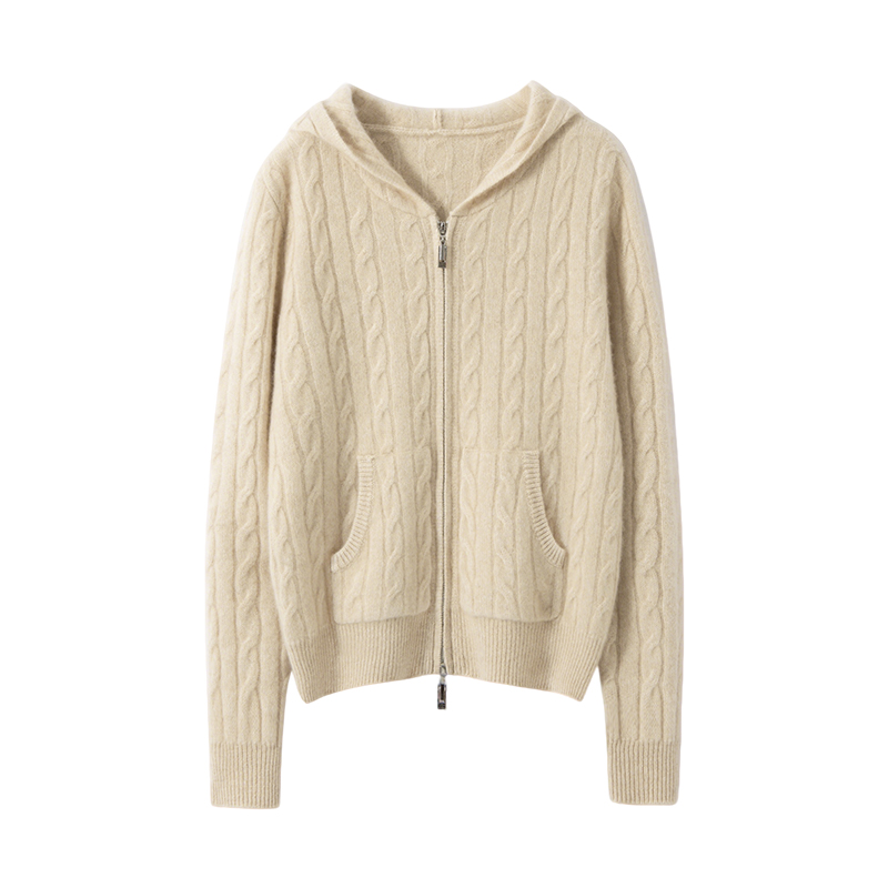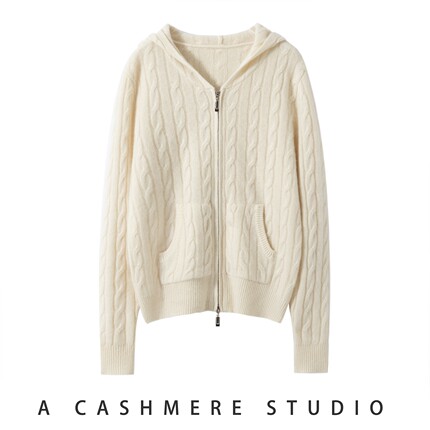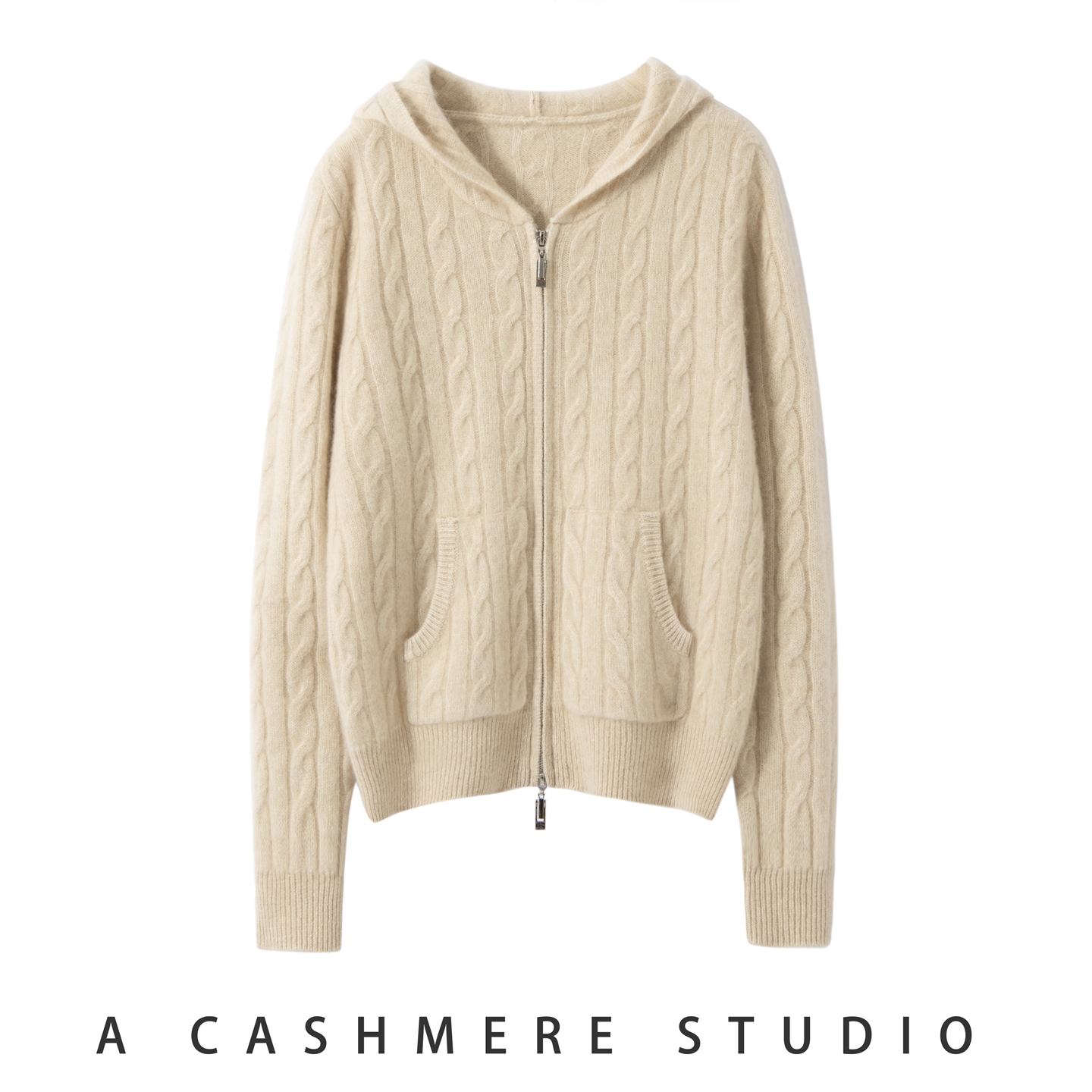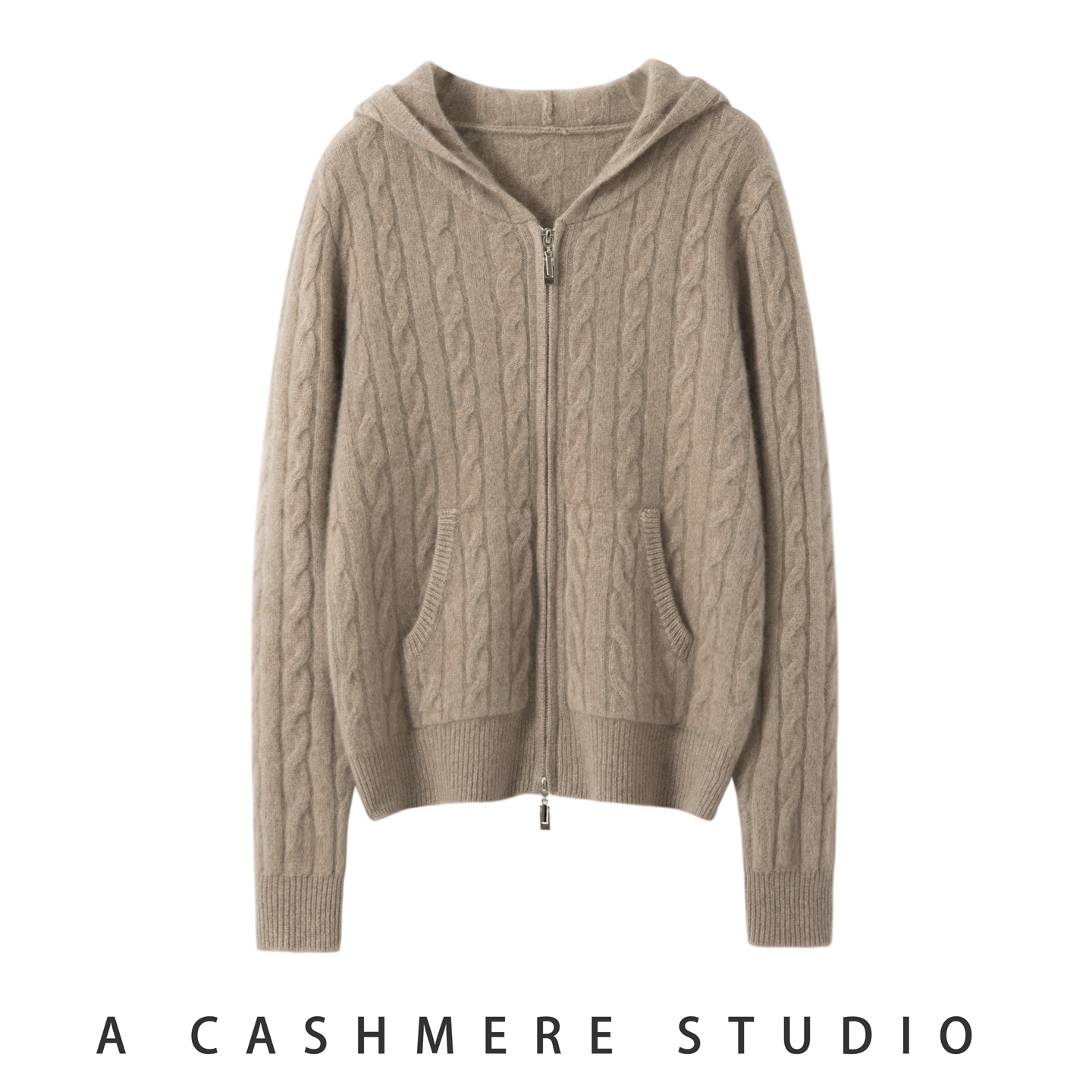 2025新款秋冬100%纯山羊绒衫女连帽针织绞花加厚宽松拉链开衫外套