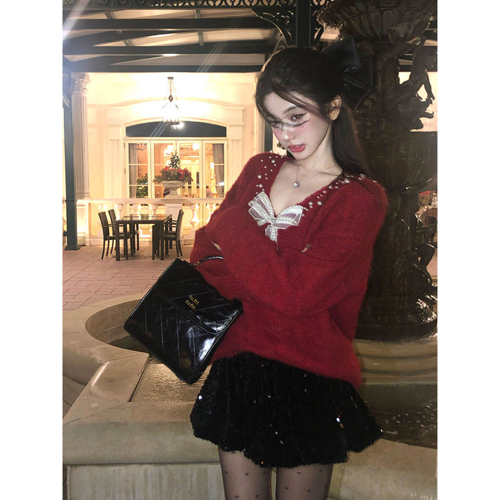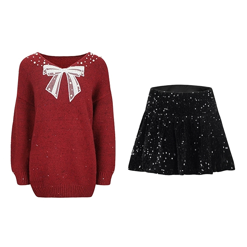 圣诞新年套 法式蝴蝶结针织衫毛衣+包臀短裙女冬季气质高级感套装