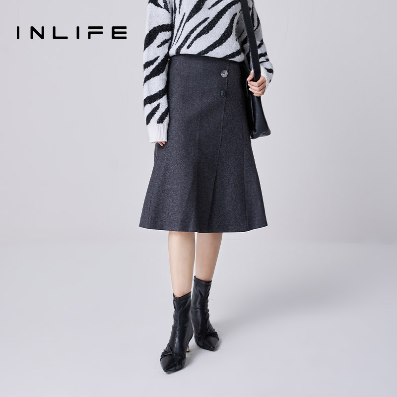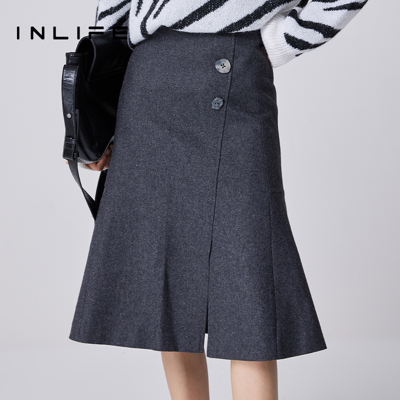 伊纳芙法式加厚毛呢半身裙秋冬新款气质包臀开叉鱼尾裙高腰中长裙