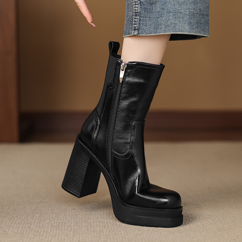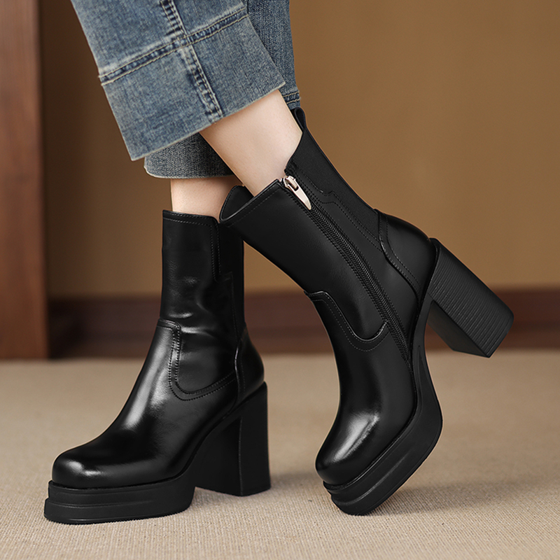 10cm防水台粗跟超高跟短靴女小个子厚底高跟时装靴圆头侧拉链靴子