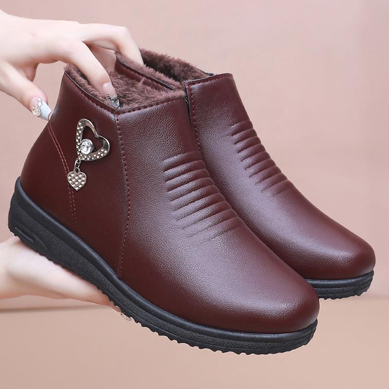 棉鞋女冬季加绒加厚中老年人棉靴防水防滑黑色皮鞋保暖舒适妈妈鞋