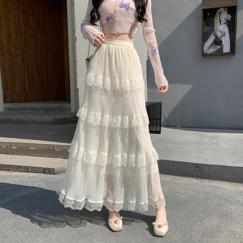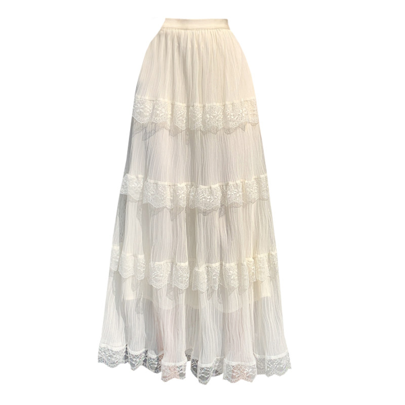 蕾丝拼接半身裙女伞裙夏季新款宽松长裙白色蛋糕裙a字大摆半裙子