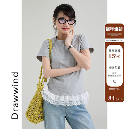 画风drawwind圆领短袖T恤女2025新款夏季休闲宽松正肩蕾丝边上衣