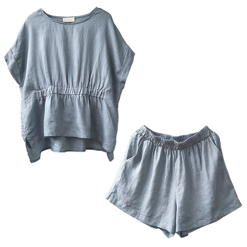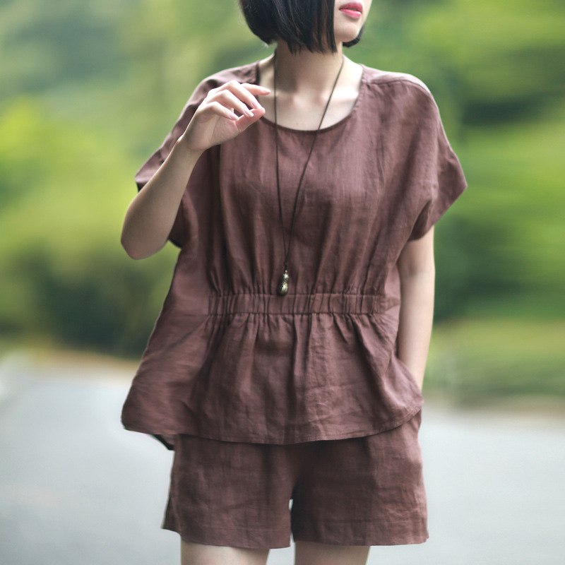 苎麻文艺复古宽松大码松紧腰遮肚套装大码女棉麻短裤休闲两件套