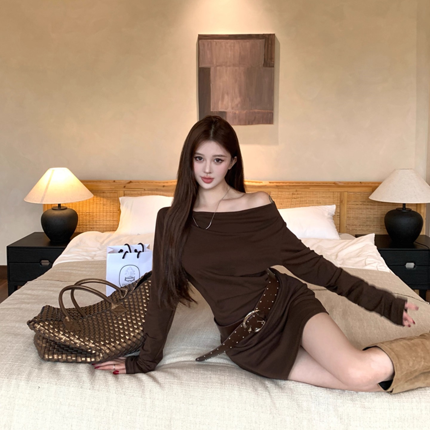 纯欲辣妹斜肩长袖T恤+短裙套装女
