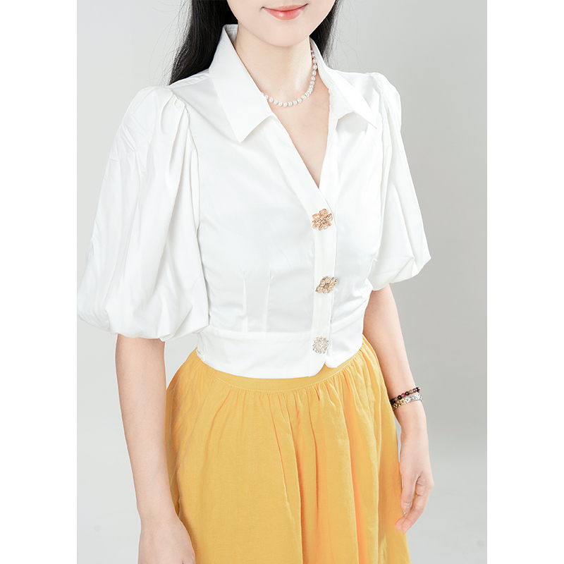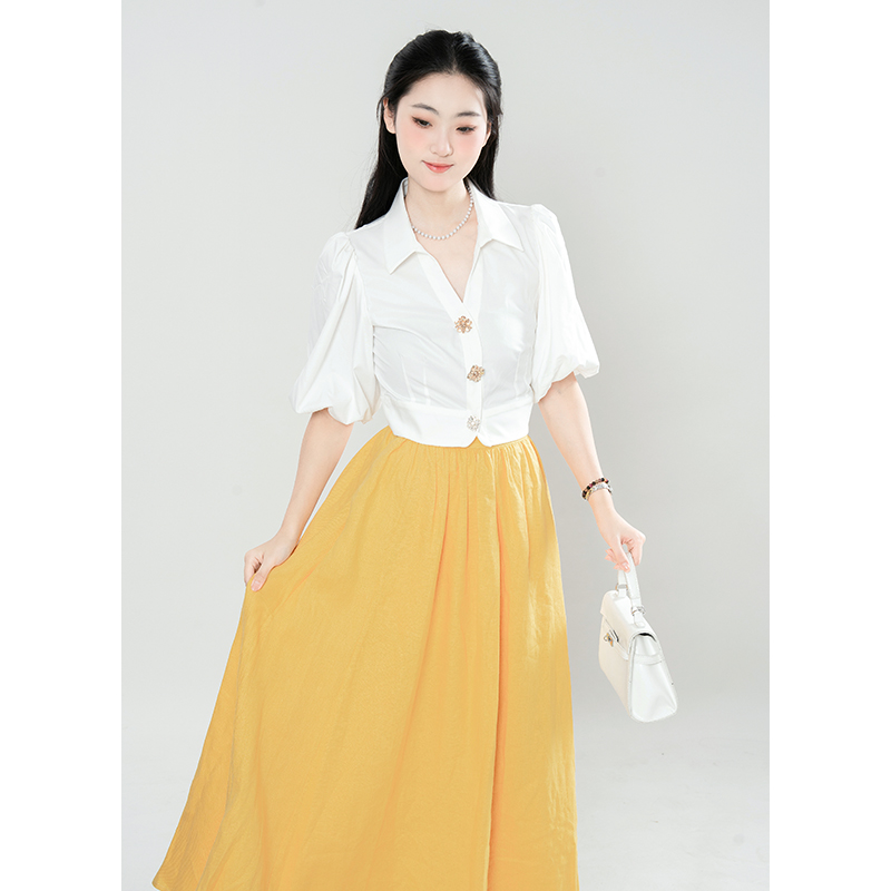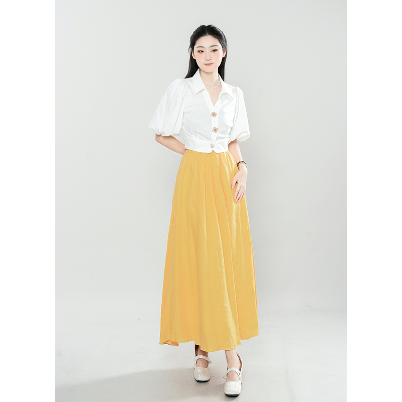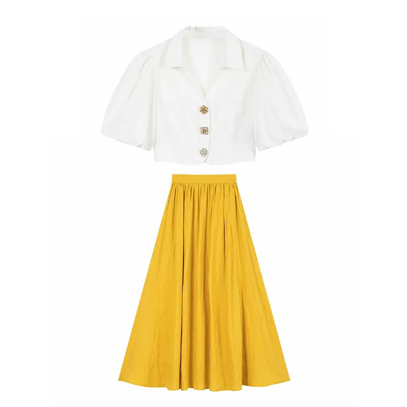 【黄玫瑰】度假泡泡袖宫廷风上衣+黄色半裙新款套装女夏裙子女