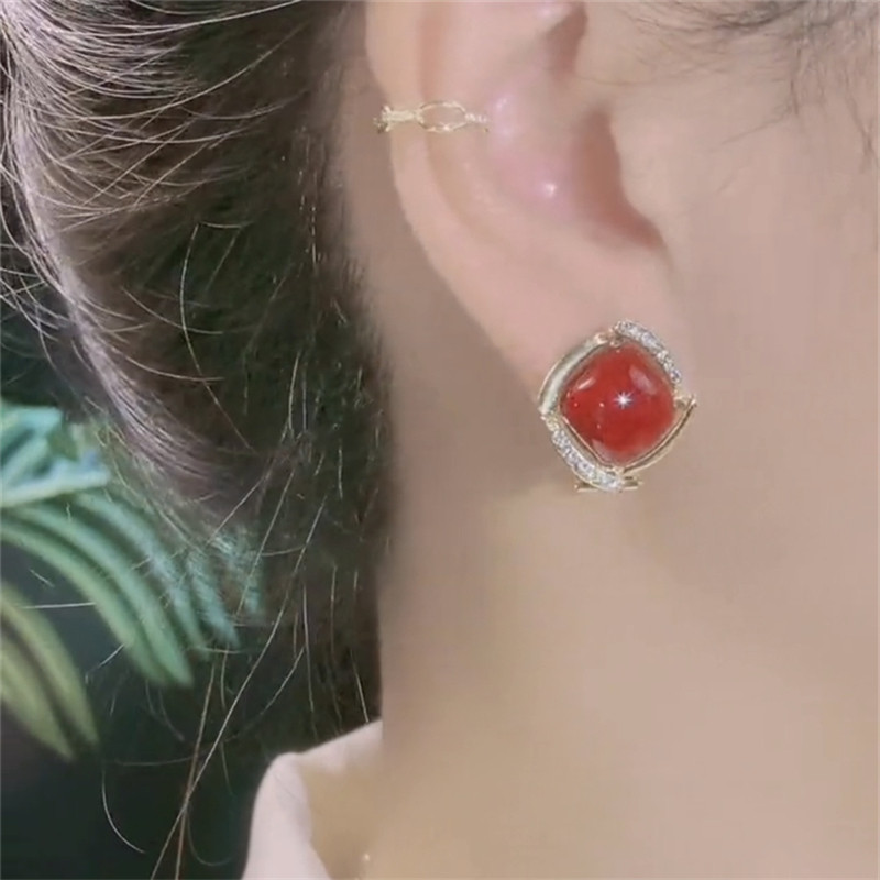 小众设计感红色方形银针耳钉轻奢高级感耳环时尚精致百搭新年耳饰