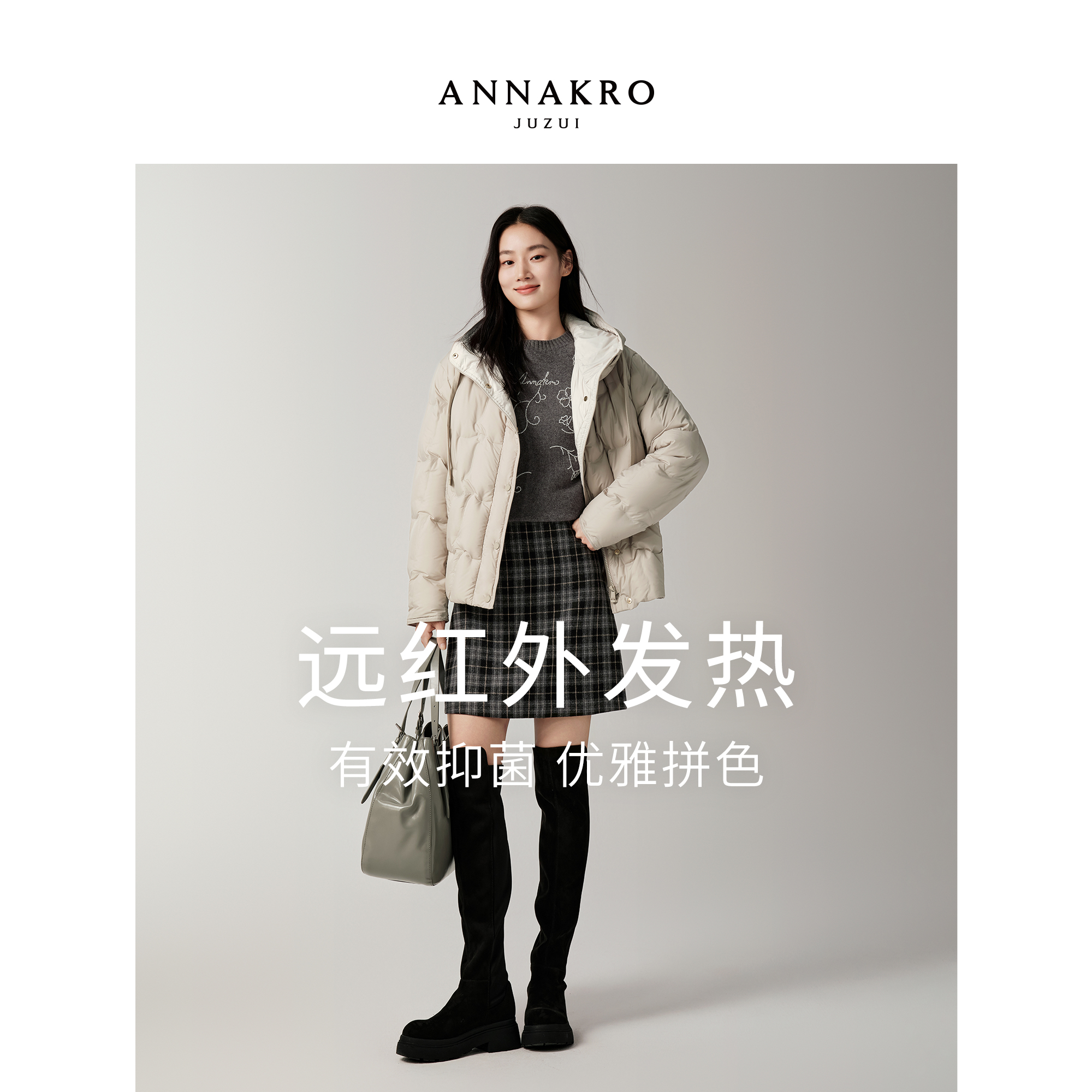 玖姿安娜蔻休闲通勤风撞色连帽发热短款鹅绒羽绒服女2025冬季新款