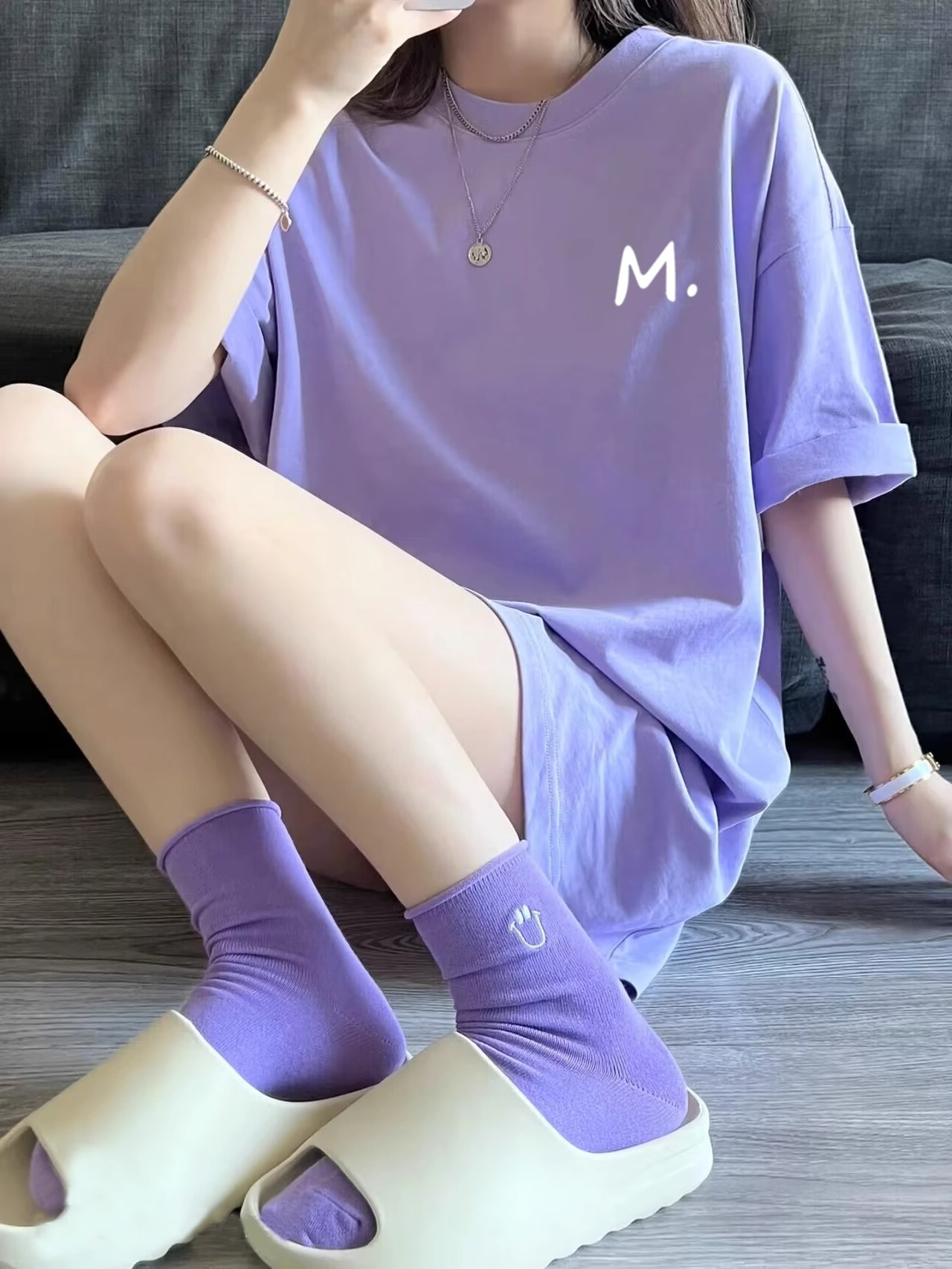 香芋紫2025年新款短袖纯棉t恤女夏季宽松大码休闲小众中长款上衣