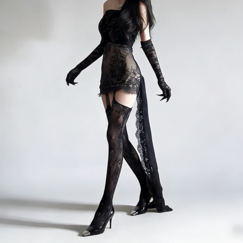 洛丽塔性感花边渔网长筒花纹丝袜y2k复古黑丝jk过膝吊带袜薄款