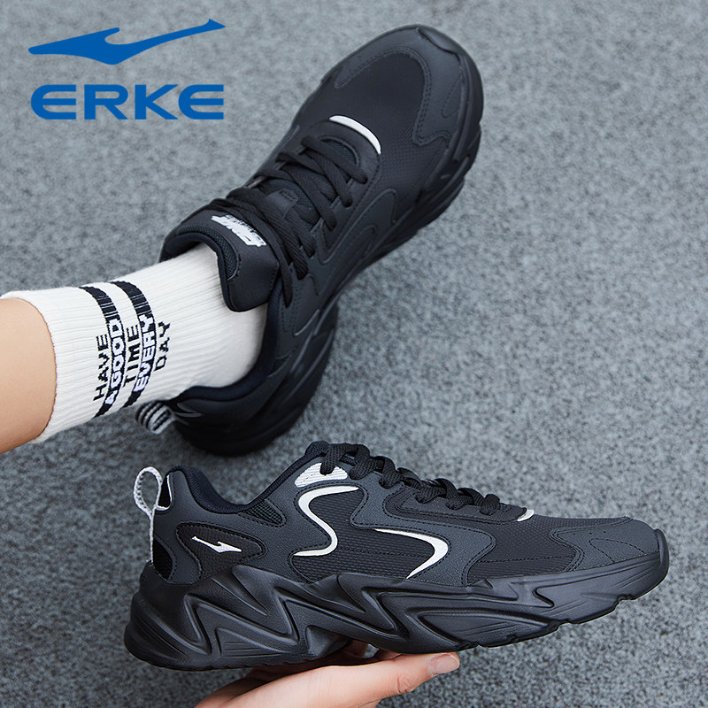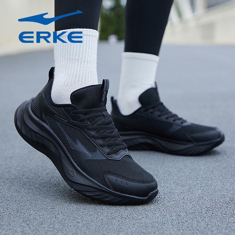 鸿星尔克男鞋2025秋冬季新款减震回弹纯黑软底爸爸黑武士运动跑鞋