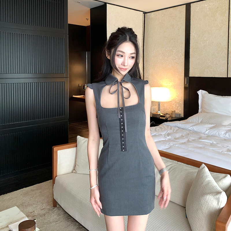 Boamarket vintage dg灰色连衣裙女夏新款立领设计蝴蝶结绑带裙子