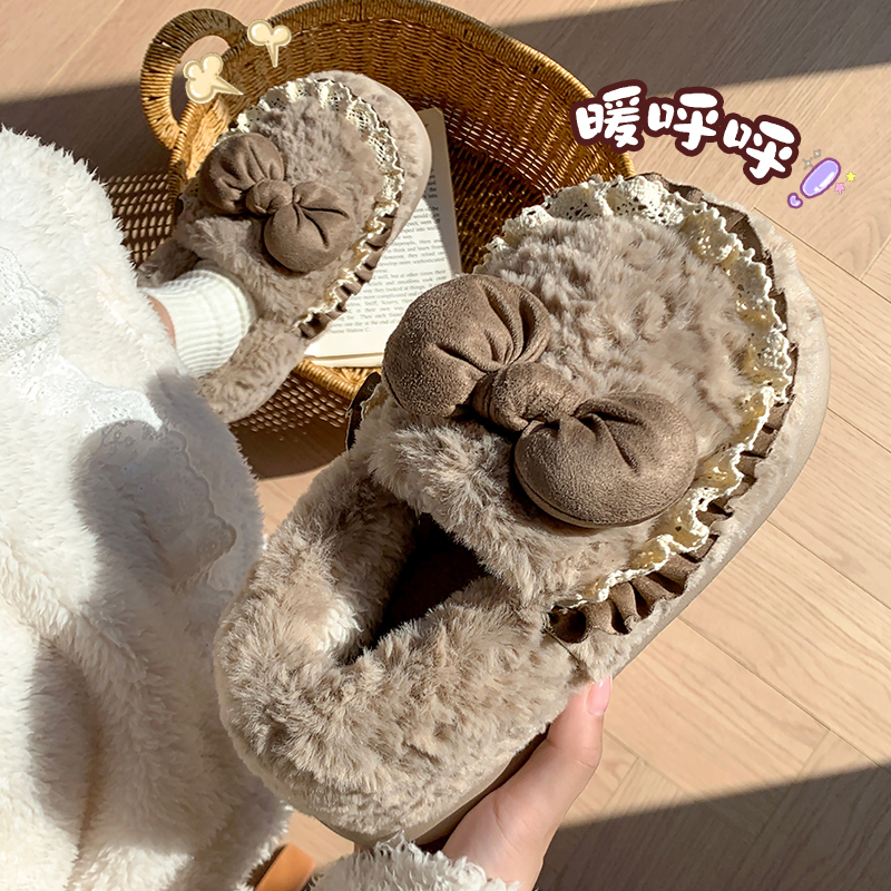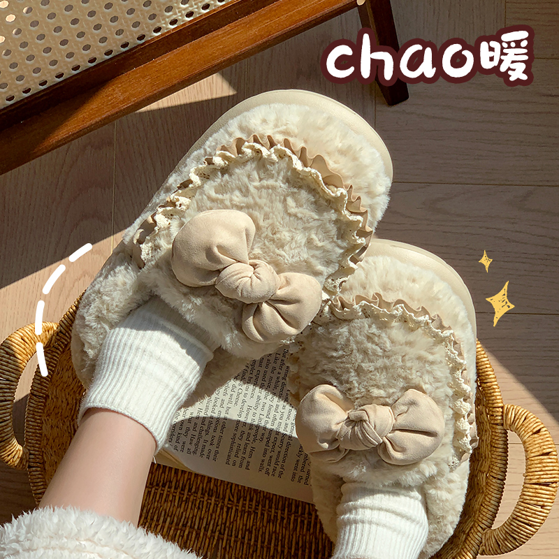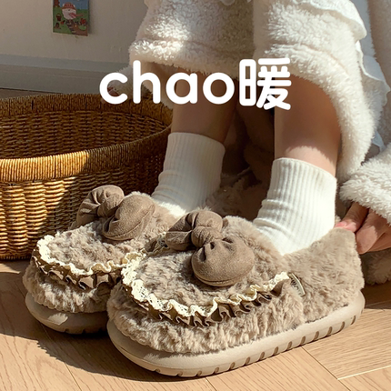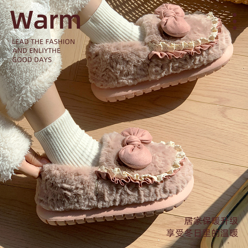 少女心棉拖鞋女冬季加绒加厚保暖室内家居可爱毛毛蝴蝶结包跟棉鞋