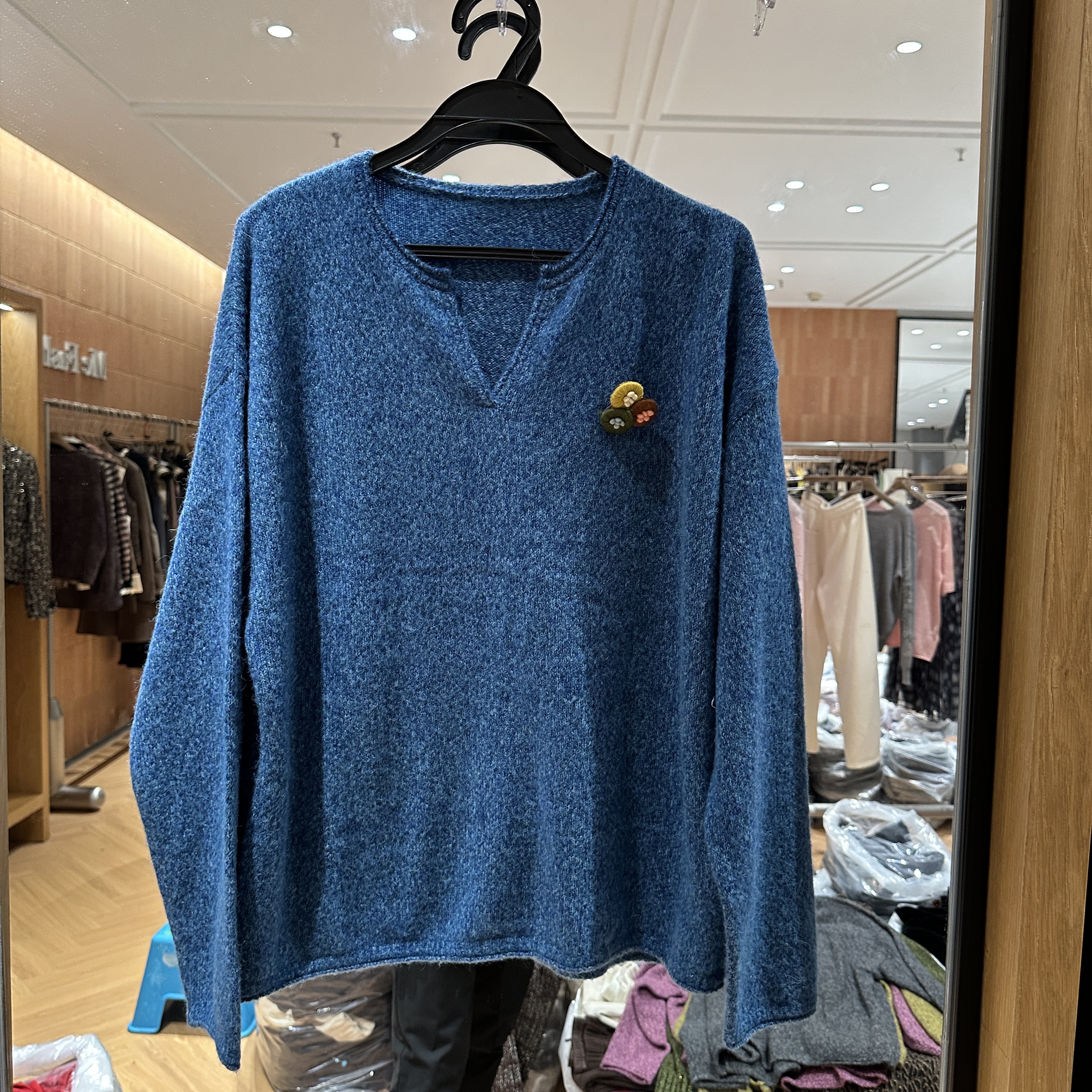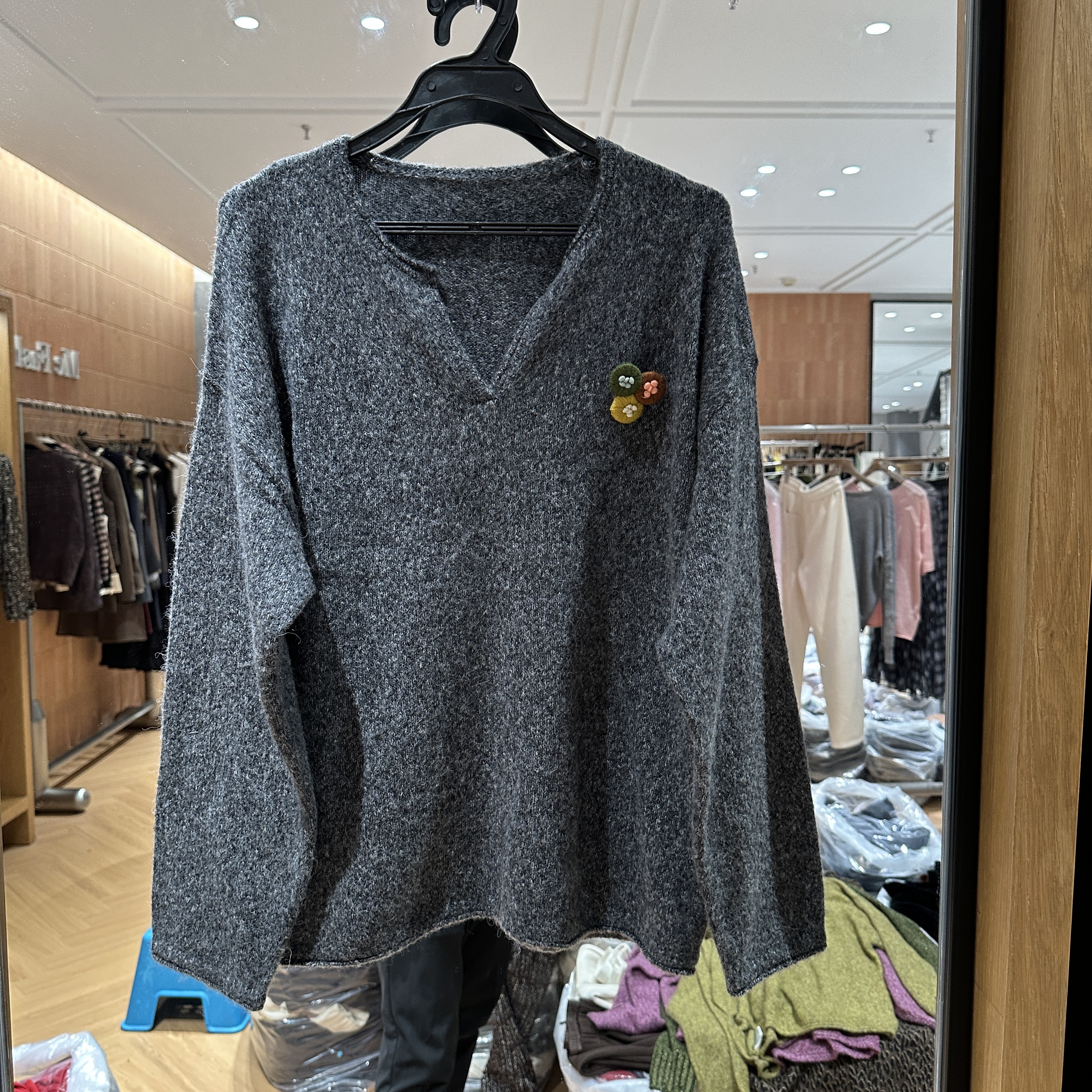 欧洲站2025秋季新款剪刀领胸针挂件软糯甜美风宽松长袖套头针织衫