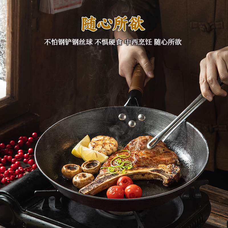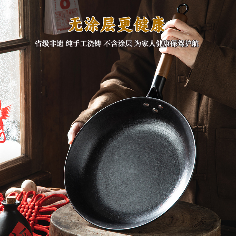 龟纹平底煎锅无涂层家用生铁铸铁锅炒锅专用牛排蛋饼煎盘陆川铁锅