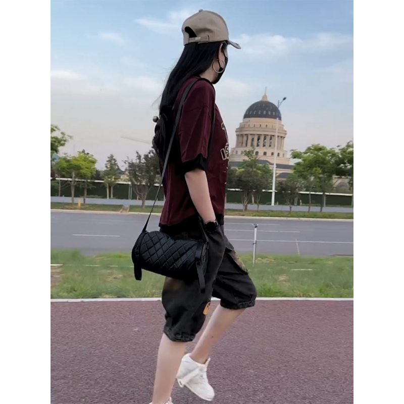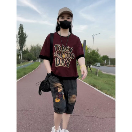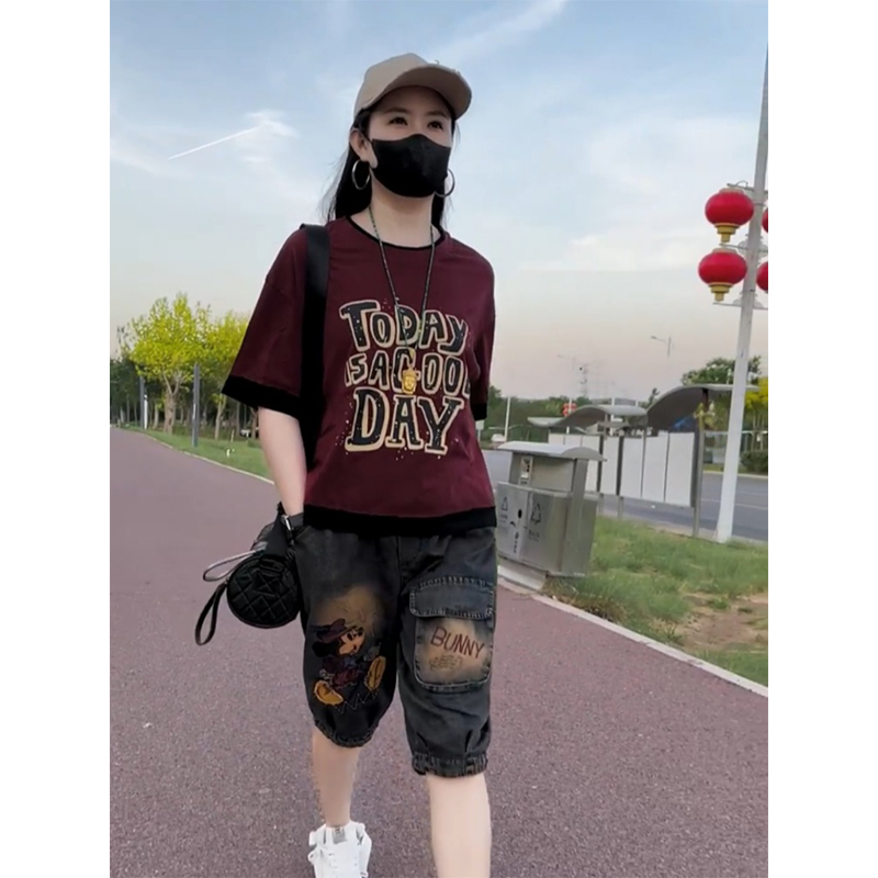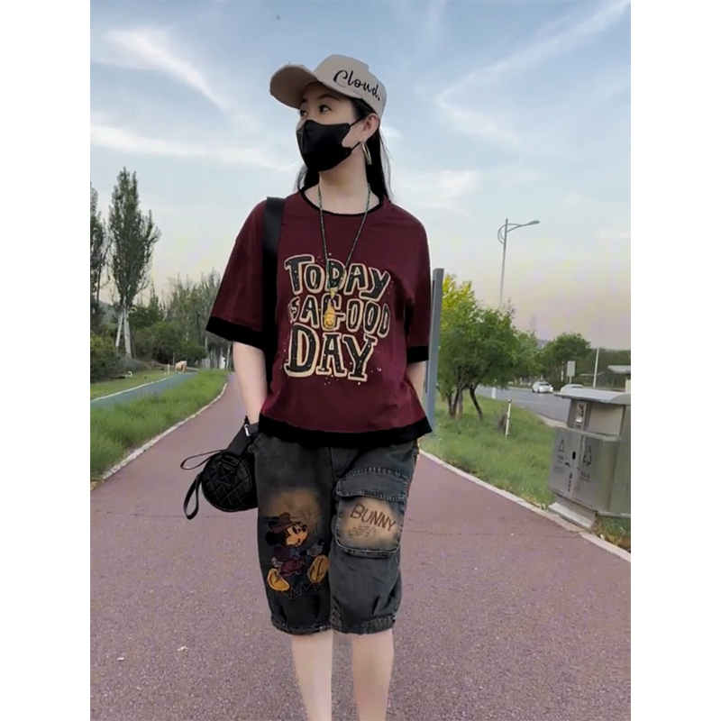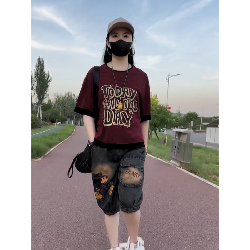 时尚洋气短袖套装2025年夏季新款宽松百搭印花t恤+卡通牛仔六分裤